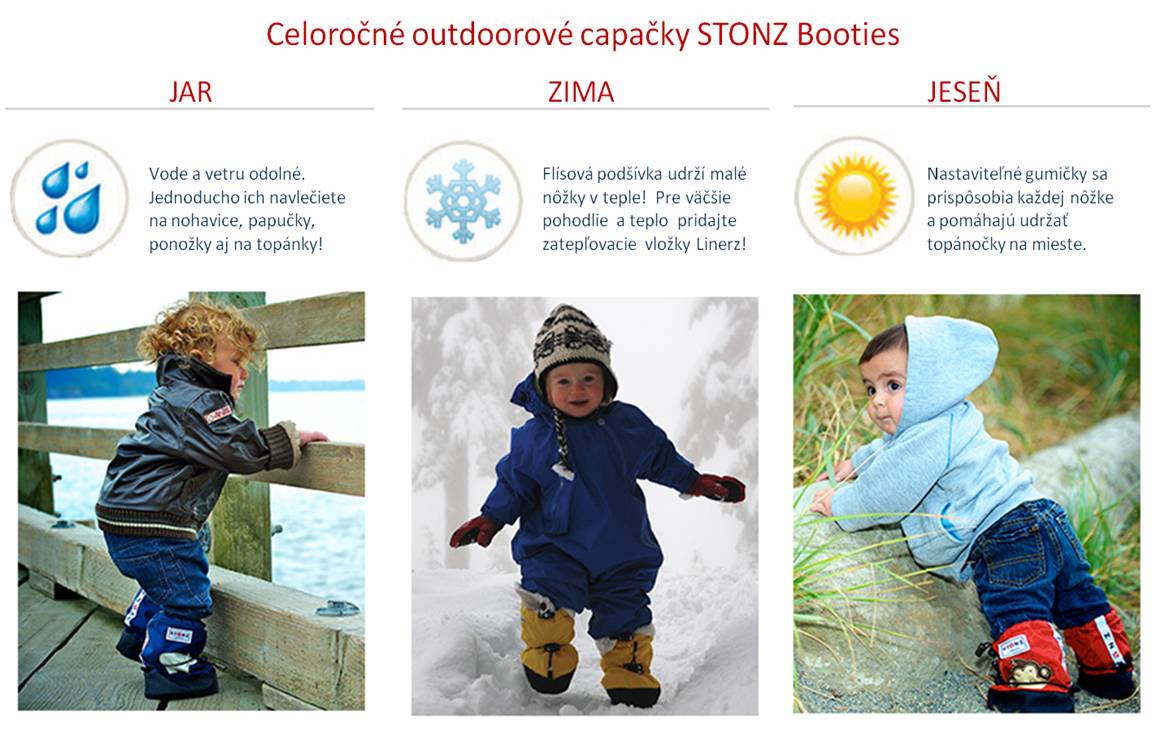 Pre naše stredoeurópske podnebie, ktoré počas roka ponúka celú škálu počasia, predstavujú capačky Stonz Booties naozaj univerzálne, odolné a vysoko funkčné riešenie ako obuť dieťatko von do prírody „naboso“. Takže či do snehu, na pieskovisko, do lesa, do parku... tu nikde Vás Stonz Booties určite nesklamú.