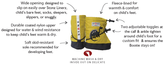 Dizajn Stonz Booties je navrhnutý tak, aby maximálne uľahčili rodičom aj deťom prácu s obúvaním. Topánočky majú široký otvor, aby sa ľahko navliekli na bosú nôžku, ponožku, papučku, ale aj na zatepľovaciu vložku Stonz Linerz či oblečenie. Zvršok je z vode a vetru odolného nylonu, vnútro je potiahnuté flísom, takže malé prstíky zostanú v teple a suchu. Unikátny dizajn s dvoma uťahovateľnými gumičkami umožňuje, že Stonz Booties sa skvele prispôsobia úzkej aj širokej nôžke a nezošmyknú sa!!!