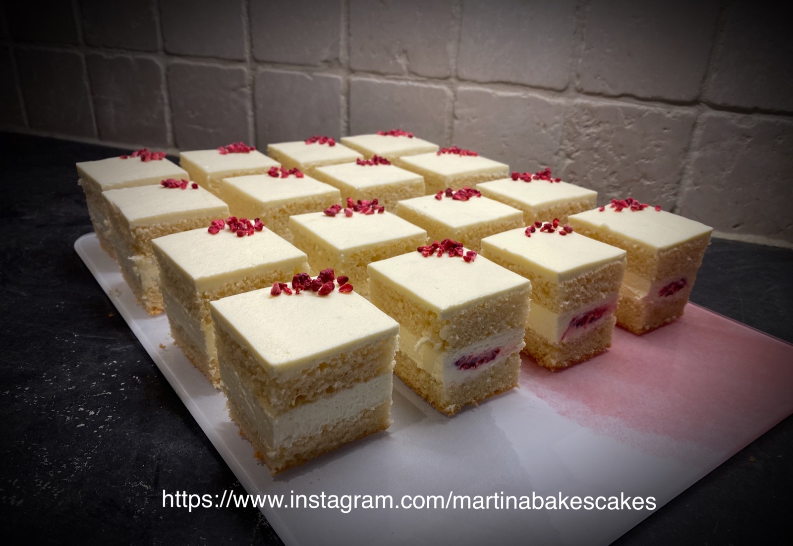 uplne obycajny vanilkovy korpus, vanilkovy krem a cerstve maliny…ale ked sa to pekne nakraja, tak z uplne obycajneho kolaca vzniknu “luxusne” kolaciky