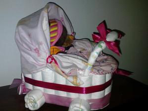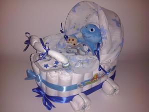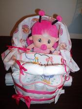 kociarik je zlozeny z cca 35ks plienok, obsahuje jednu zdobenu platenu plienocku, jeden podbradnik a jednu plysovu hracku alebo babiku - toto je zakladna vybavy...podla poziadavky zakaznika, moze byt tento kociarik aj plneny dnu, teda plni funkciu darcekoveho kosa...