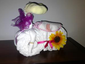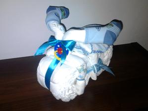 motorka sa sklada z cca 22 plienok, obsahuje aj jeden podbradnik, jeden cumlik a jeden par ponoziek - toto je zakladna vybava...podla poziadavky zakaznika moze mat aj nejaku hracku navrchu...