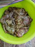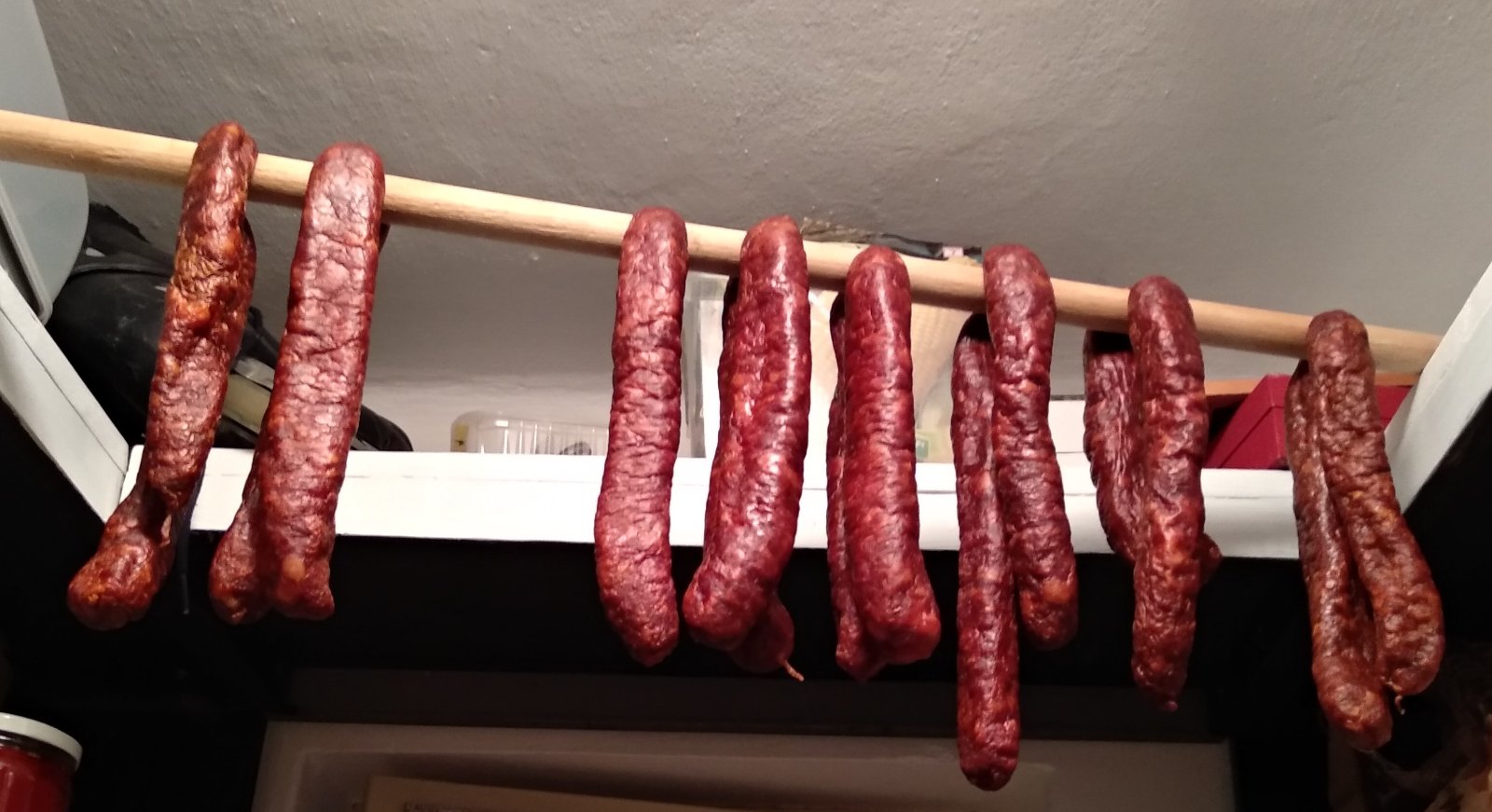 Potom davame sol,cierne korenie ,papriku cervenu sladku aj palivu a cesnak.To vsetko davame podla chuti a vzdy je to akoby viac ochutrne .Nechavame okorenene maso stat cca 12 h v chlade az potom pomelieme a ak treba znova dochutime a naplnime do criev Poveziame na palicky a nechavame v spanzi do rana a na dalsi den sa udi.Manzel dava udit do vyhriatej teplej udiarne cca 50 stupbov a klobasky mame predtym cca 2-3 hod.v izbe aby sa ohriali a tak davame udit.