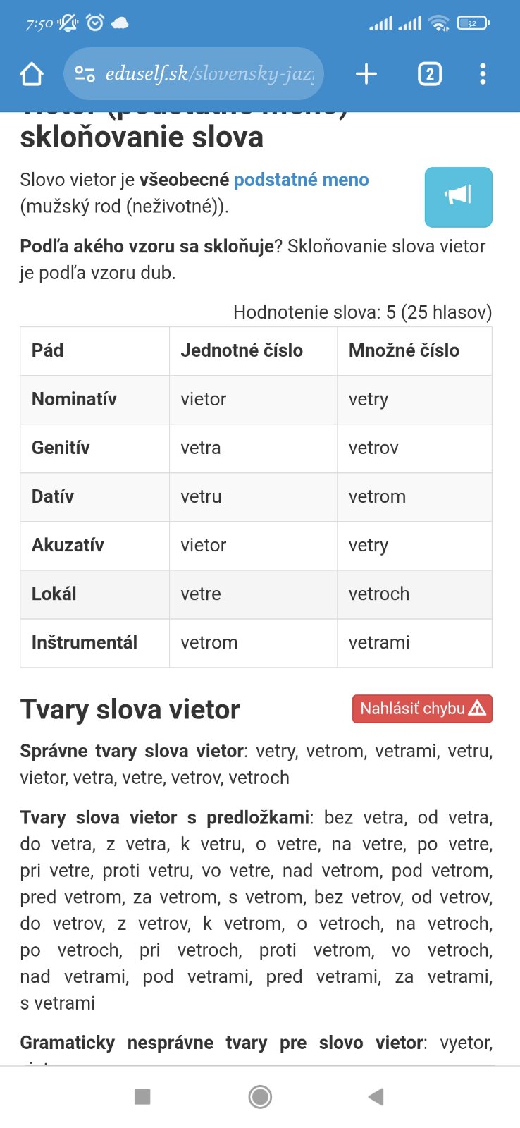 Žienky mam otazku,podla akeho vzoru sa podla Vas skloňuje slovo vietor?A ako znie vietor v mnoznom cisle? Ja si pamätám ze je to vzor dub,kedze je to nezivotne pods.meno a mn.cislo su vetry.Aj mi to potvrdil slovnik slov jazyka .Lebo neviem o tom aby sa nieco menilo, ide o to,ze dcera mala du, kde dala tento tvar takto Ucitelka jej povedala,ze to ma zle, ze vetey ma akurat z prdov a spravne je vetre od vzoru stroj.A tym padom nemala du spravne, nedostala plny pocet .Co je teda o k?