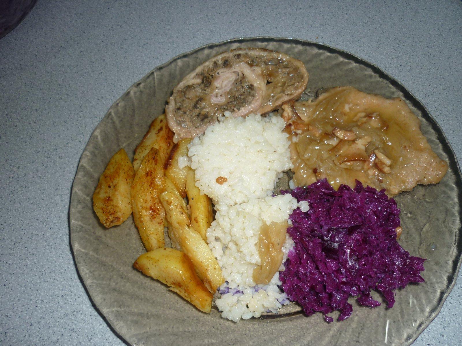 bravčová roláda plnená dubákmi +rezne na prírodnom s karamelizovanou cibuľou a slaninou+ryža +pečené zemiaky +šalát z červenej kapusty
