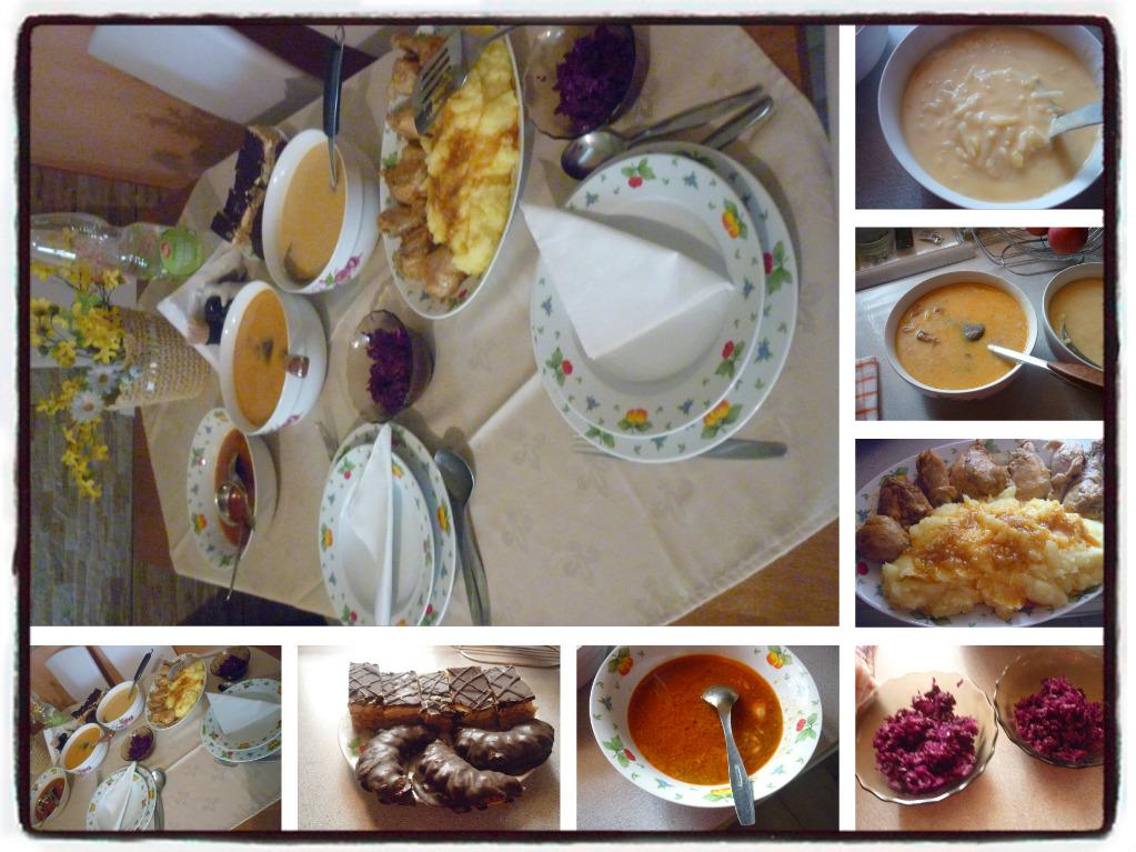 kapustová polievka +zemiakovú s údeným od soboty +zemiaková kaša +kuracie mäso na šťave+kapustový šalát +koláčiky