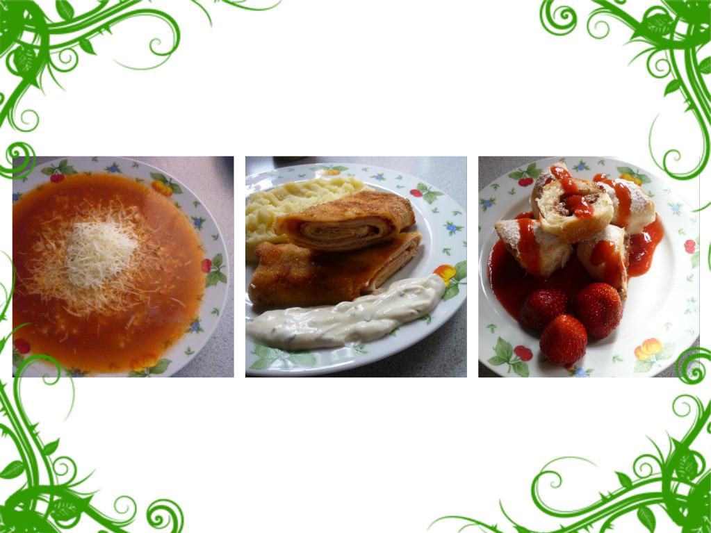 rajčinová polievka zo včera+palacinky plnené na slano +zemiaková kaša a tatarská omáčka +čokoládové bucht s jahodovou penou a jehodami