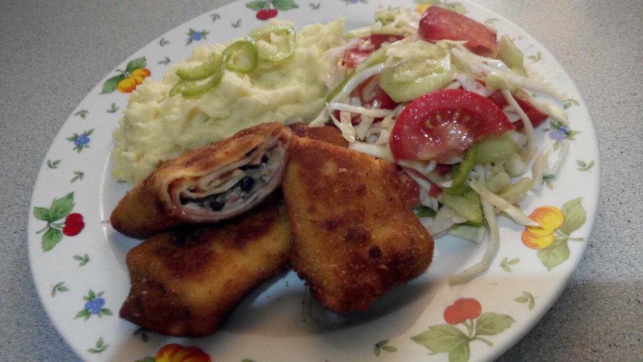 slané palacinky plnené šunkou syrom a šampiňónovou plnkou +zemiaková kaša s maslom+kapustovo-zeleninový šalát