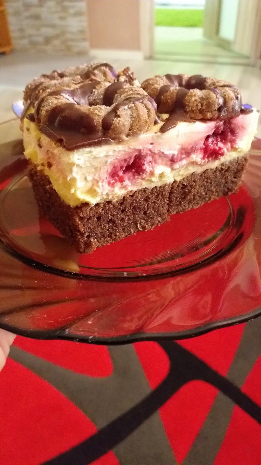 Na piskotu som dala maslove jogurtovu krém na to maliny a na vrch ten slahackovo jogurtovy krem(do toho maslovo jogurtovy som dala trošku žltej farby)