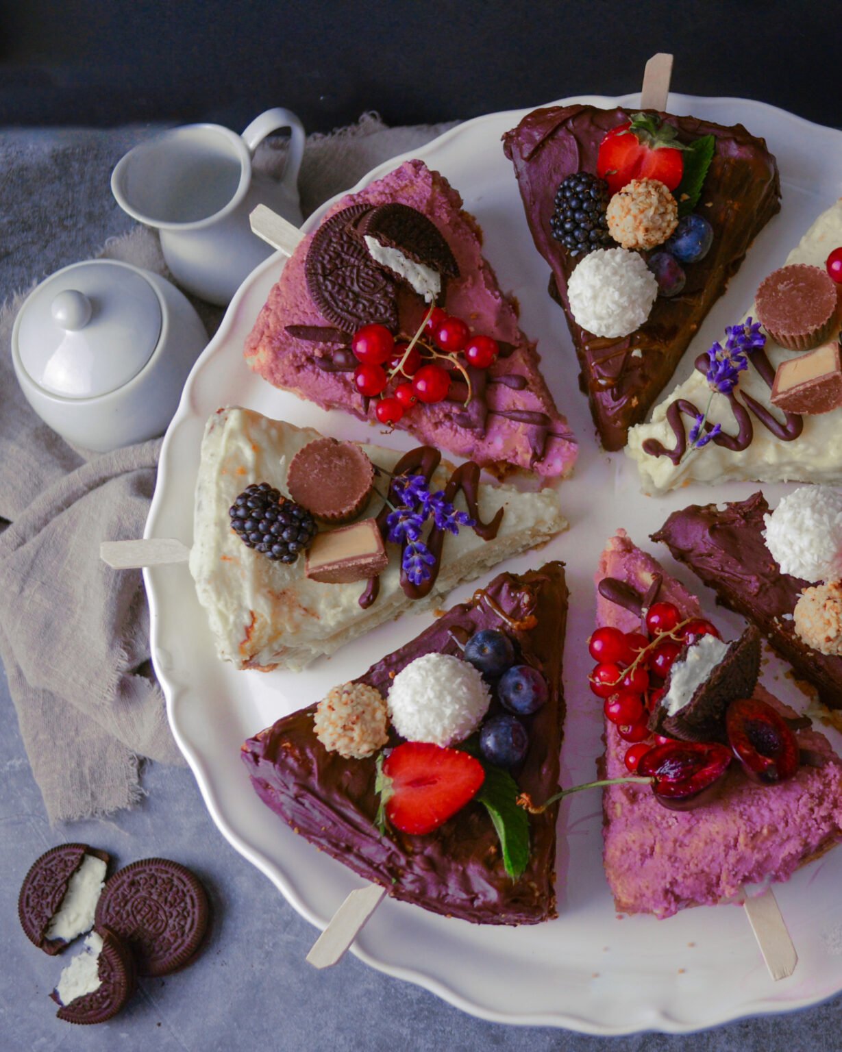 Farebný chessecake na paličke s rôznymi polevami.. Tento nápad spraviť cheesecake na spôsob lízatok som raz zahliadla na internete a je to naozaj super praktické, napríklad aj na záhradnú slávnosť. Netreba špiniť riad a každý si môže vybrať chuť podľa vôle.