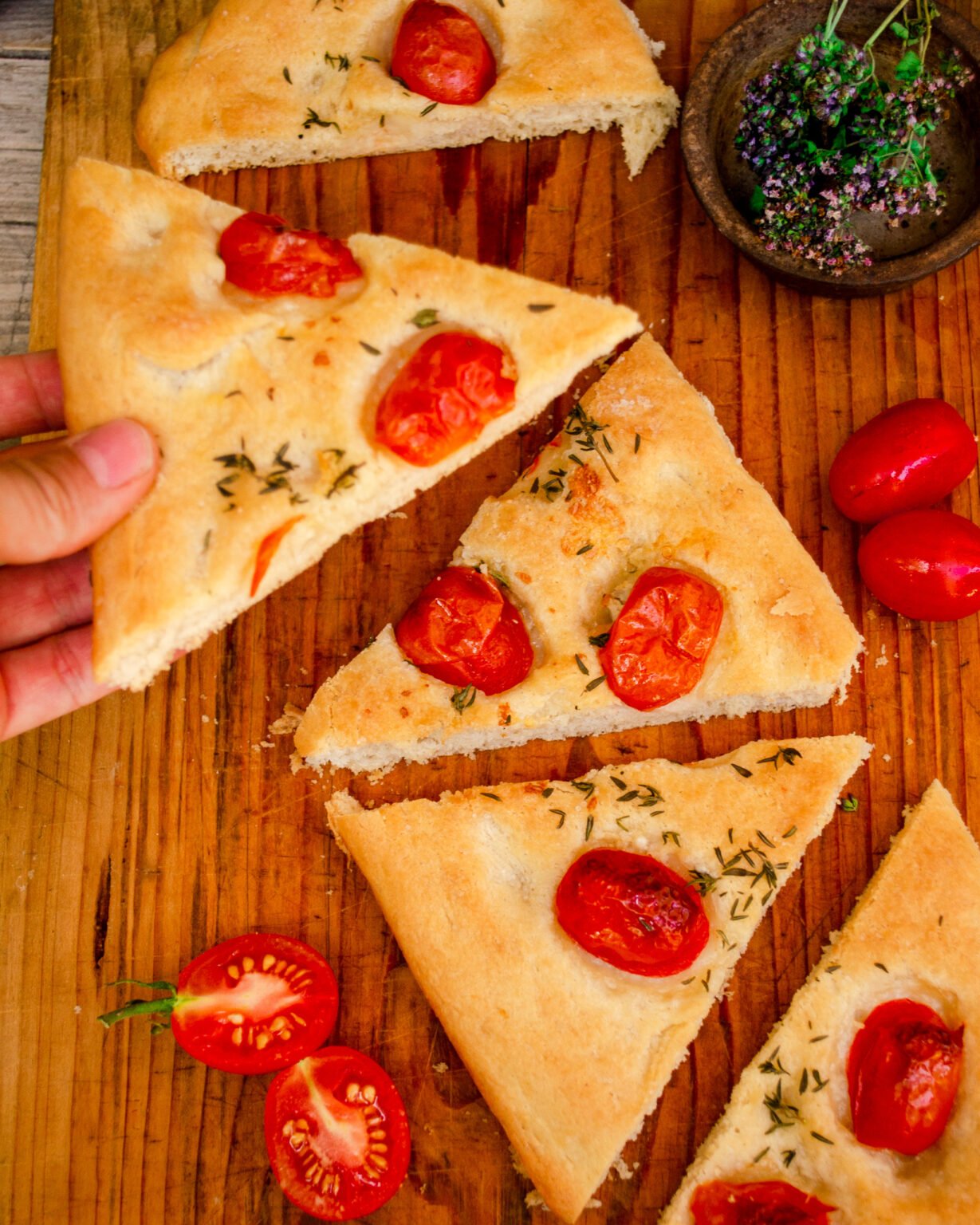Focaccia- základný recept. Focaccia je talianský plochý chlieb, ktorý sa obkladá zeleninou. Je to inak skvelé jedlo na prípravu s deťmi, tieto ho môžu ľubovolne podľa predstavivosti obložiť napríklad rajčinamy, bylinkami atď. a vytvoriť tak jedlé obrázky