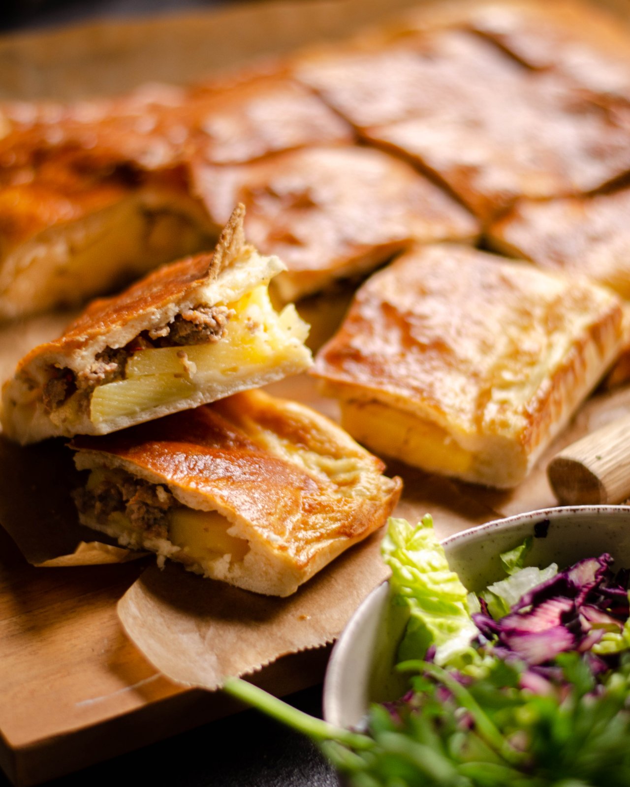 Slaný koláč Pirog - kombinácia nadýchaného cesta s chrumkavou kôrkou s mäsovo-zemiakovou plnkou. Výborný jednoduchý pokrm, vhodný tiež na pohostenie či na piknik.