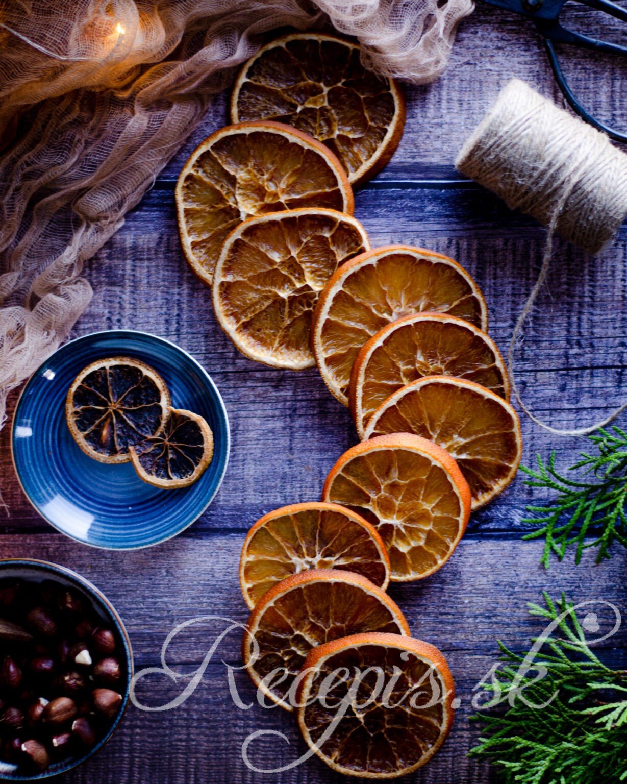 Tieto pomaly sušené kúsky pomarančov sú krásnym a voňavým darčekom, ktorý viete pripraviť aj na poslednú chvíľu. Či si z nich vytvoríte voňavé reťaze alebo len pridáte po kúsku k darčeku, alebo priviažete o balíček s napečenými sladkosťami, je to vďačný darček a jednoducho hotový.