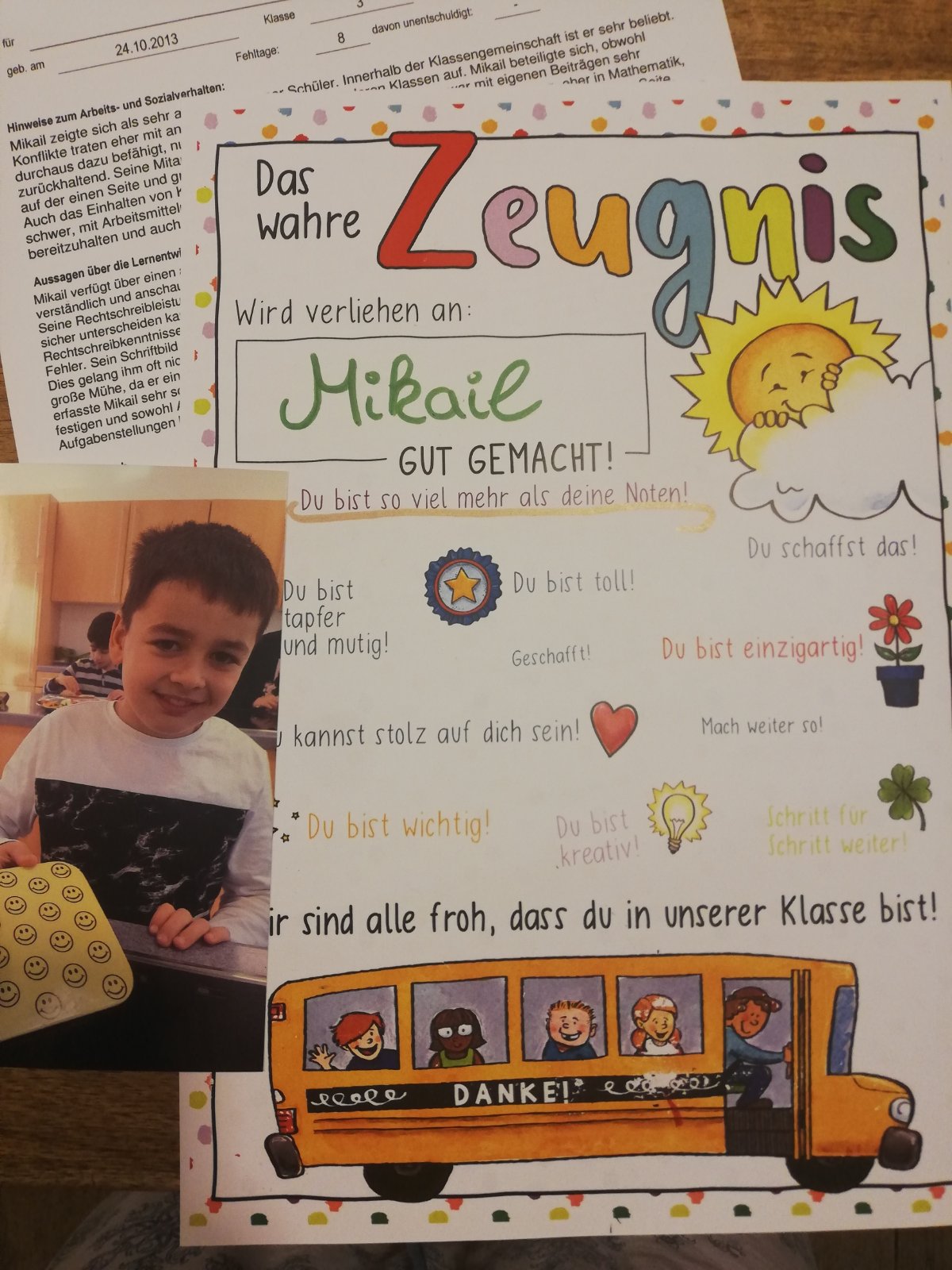 Toto ma dojalo, deti u nás už dostávali polročné vysvedčenie (Nemecko) a triedna učitelka priložila k tomu klasickému toto "jej" vysvedčko. Je tam napísané, že si viac ako len známky a potom pekné vlastností, ktoré to dieťa má. Zakončené vetou- sme radi, že si v triede a priložila jeho fotku, ktorú odfotila v škole. No toto je naozaj super. Klobúk dole pred tou učitelkou.