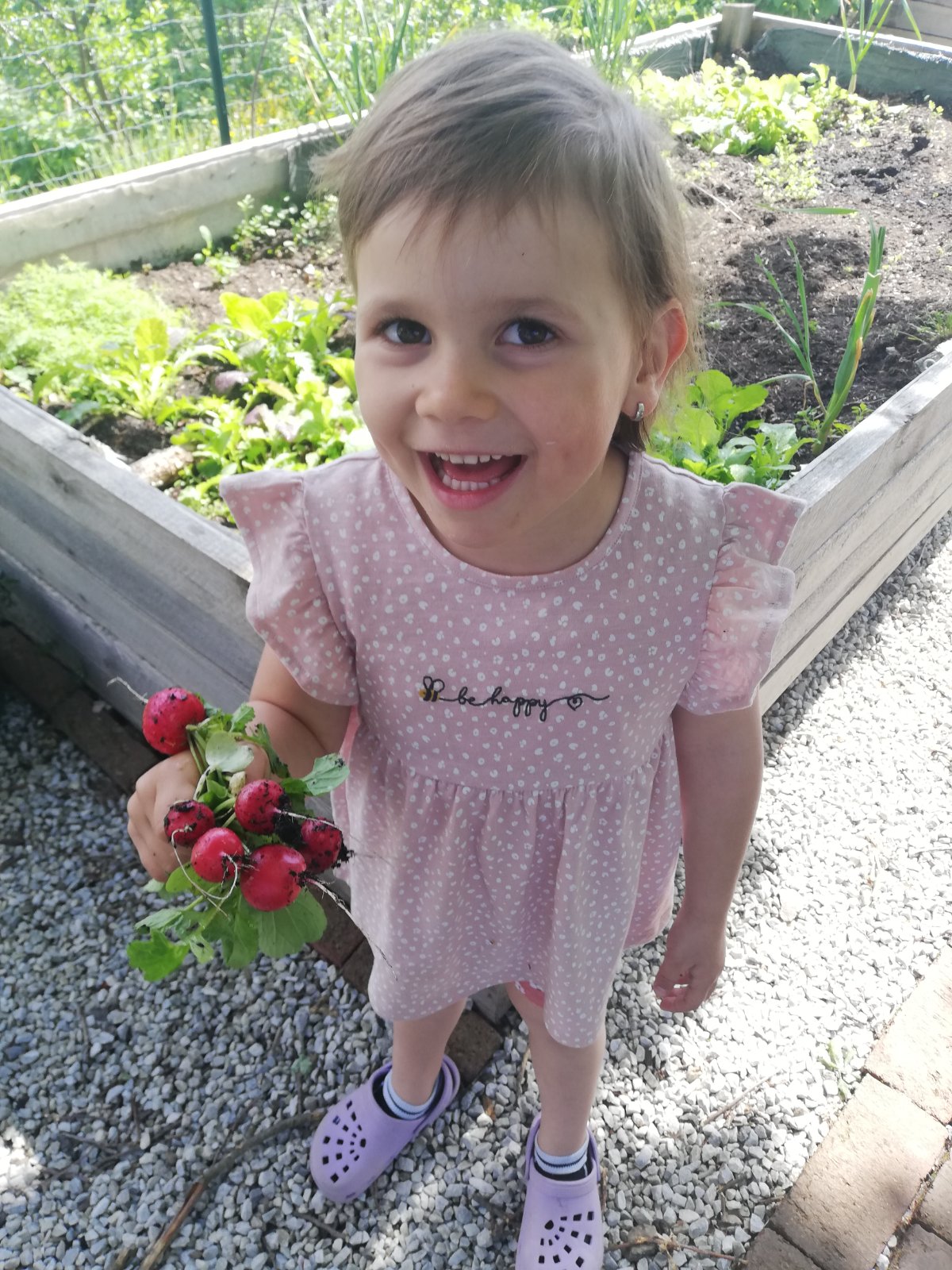 Zbierame reďkvičky v záhrade a tešíme sa z prvej tohotoročnej úrody