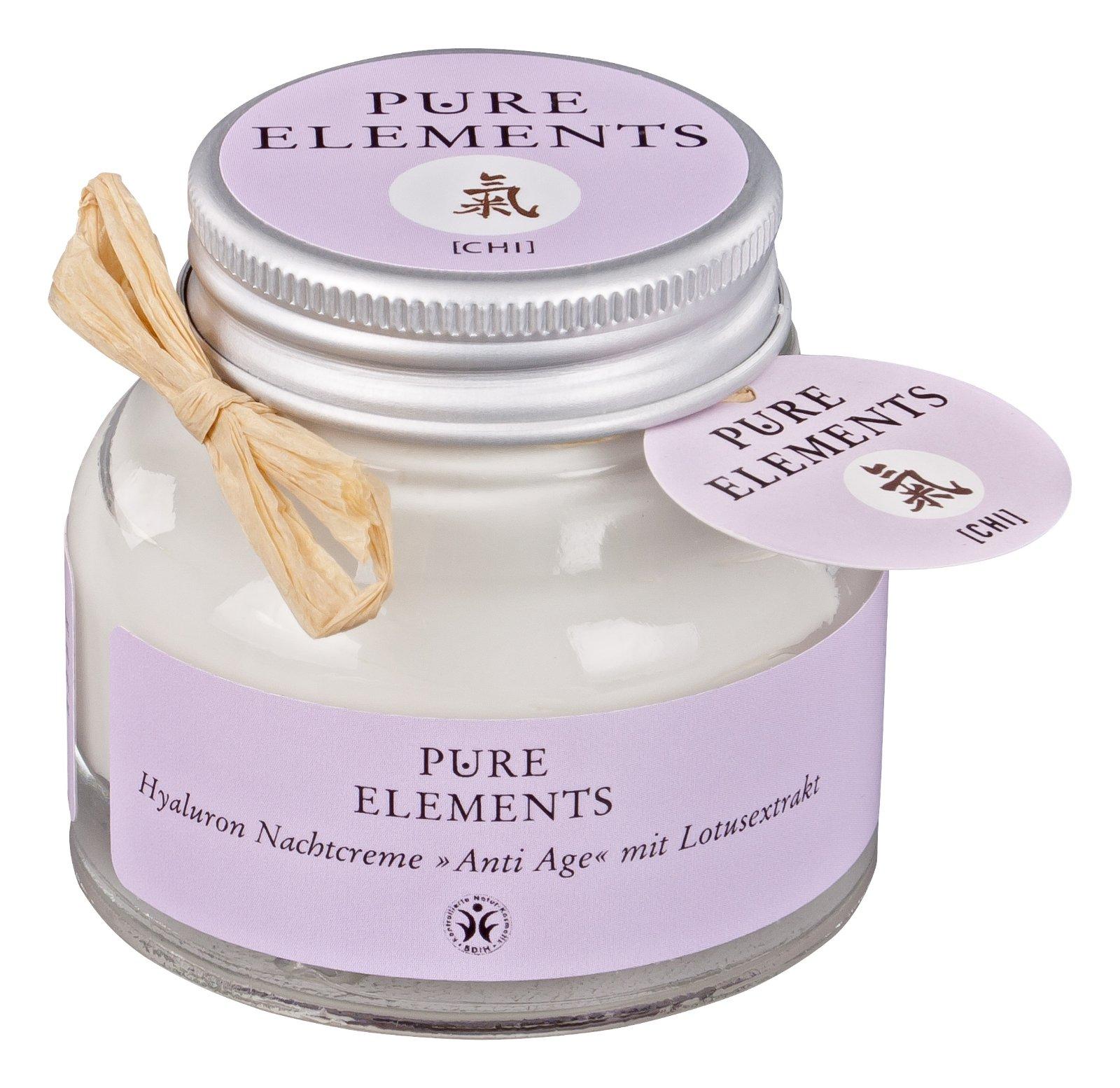 Nočný krém Anti-Age PURE ELEMENTS obsahuje vzácny výťažok z Lotosu, vosk carnauba, maslo capuacu, bambucké maslo, domáci olivový olej, prírodný Vitamínom E a hyalurónové lipozómy. Neobsahuje umelé konzervatny a alergické vône.