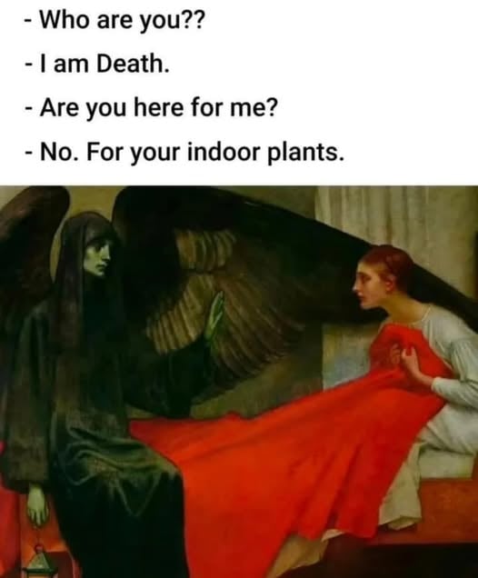 Výjav z našej domácnosti 😂😂😂😂- Kto si?- Som smrť. - Prišla si po mňa?- Nie, prišla som po tvoje izbové rastliny.🙈🙈😂😂