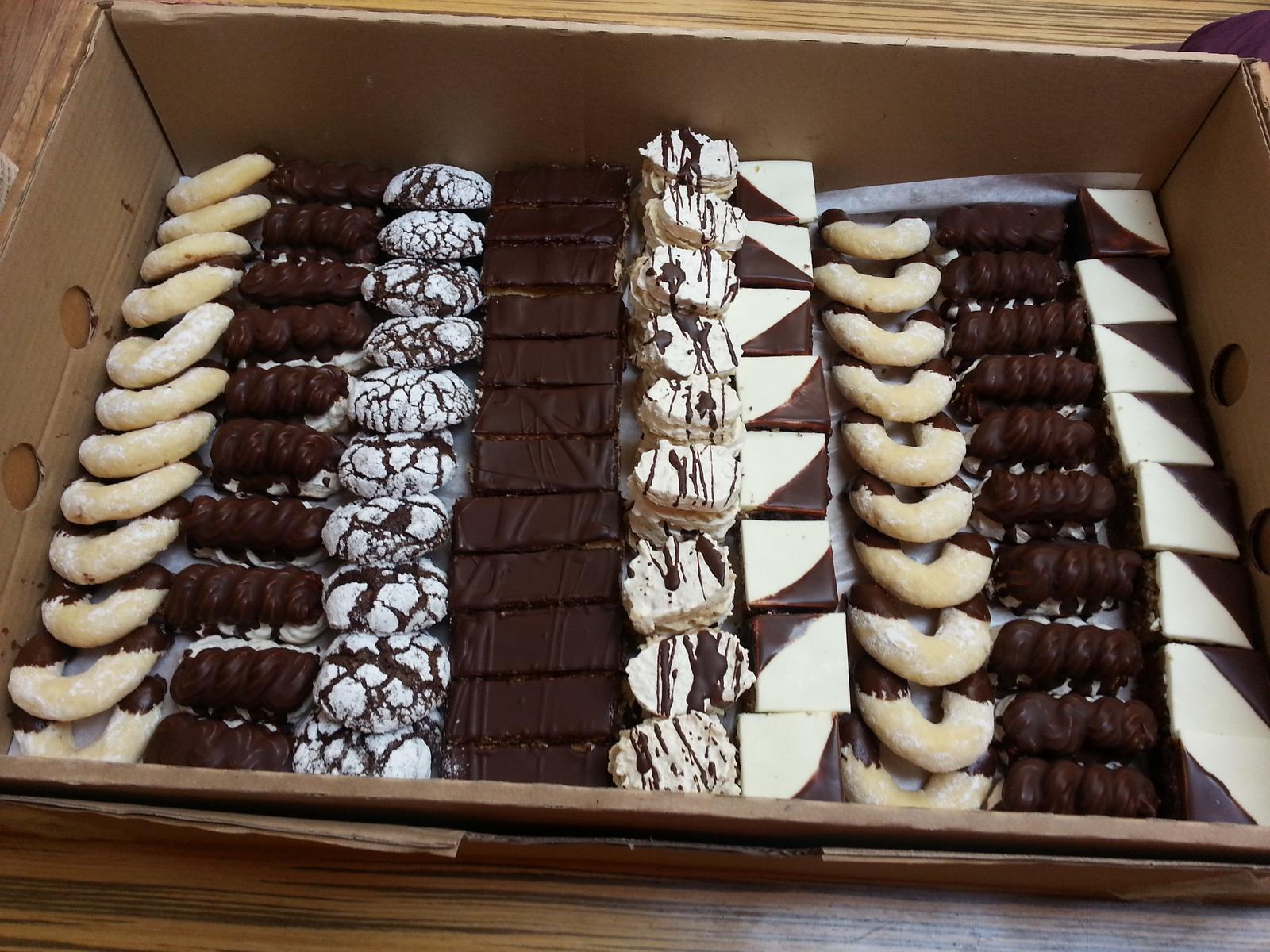 @745315 dobry den za tento 40 eur. Je tu 100 ks zakuskov. Parizske rozky,cokocrinkel,laskonky, medove rezy,kokosovo-smotanove rozky a dvojfarebne kocky.