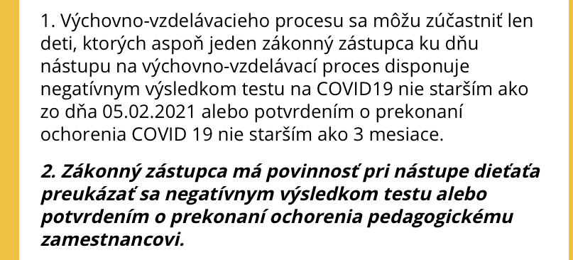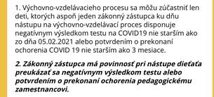 Dievky, ako ja ucim a az dnes by mal vyjst vyhlaska, ci zavezne nariadenie ako maju skoly postupovat ..snad. Bordel neskutocny, ale ak naozaj prijmu, ze staci, cestne prehlasenie je to cele o nicom. V skolke mojich synov, sme po plosnom testovani normalne ukazovali vysledok testu. Zas je to jeden test, za vzdelanie deti po ROKU, to je minimalna obeta.