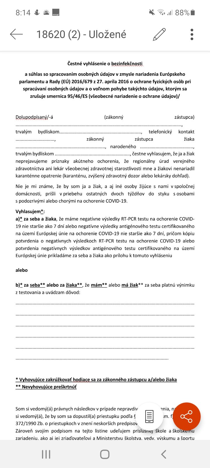 Nám prišiel email včera škola u nás sa otvára treba tlačivo o bezinfekčnosti papier z testovania pýtať nebudú nám napísali