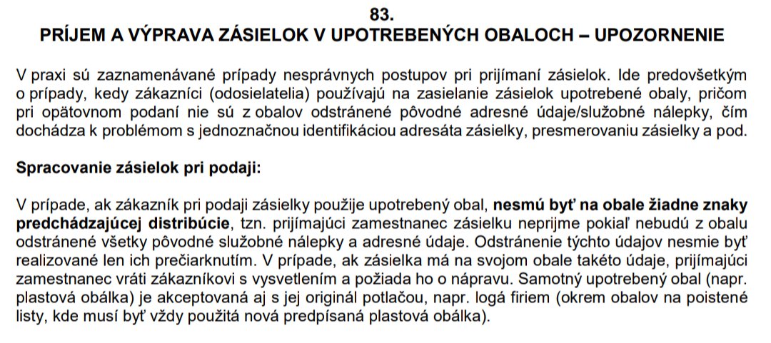 Pani mi povedala , že im prišli nové pravidlá a nemôžu mi takýto balík zobrať ak to teda neposielam na ich adresu. ( Napr : konkrétne som mala obal z Bonprix, že ak to neposielam do Bonprixu tak mi takýto balík nemôžu zobrať )