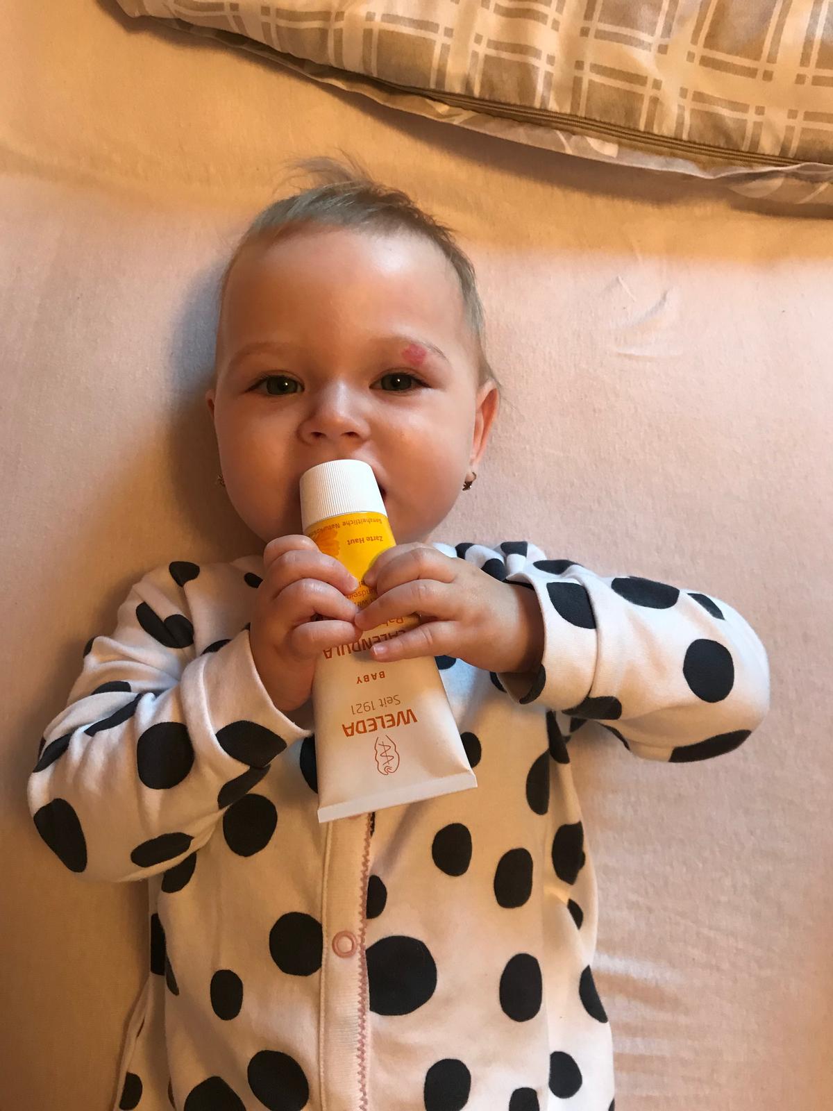 Nechtíkový dojčenský olej s nami chodí na kurz Baby plávania, keďže trávime v slanej vode aj 45 minút tak tento olej je výborná voľba aby sa jemná detská pokožka spamätala. Predtým ako sme mali tento olejček tak zvykla mať Grétka po plávaní začervenané miesta, ako keby jej začínal ekzém, ale od kedy poctivo natierame olejom od Weledy tak sa toto už nestáva. Verím, že je to vďaka fantastickému zloženiu tohto oleja len z čistých rastlinných olejov príbuzných ľudskej pokožke. Na foto spokojná Grétka po plávaní 🙂