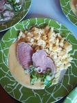 Omáčku som urobila podľa tohto receptu. Medzi tým som si vo výpeku z mäsa urestovala 3 cibule nadrobno nakrájané, podliala vývarom a nechala udusiť. Potom som zmiešala omáčku s cibuľou, pridala šľahačkovú smotanu, vymixovala ponorným mixérom do hladka a nechala prevrieť.