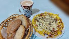 Na masle osmahnúť cibuľku so šunkou na kocky. Pridať zemiaky (uvarené v šupke, olúpané, postrúhané). Premiešať, opekať dochrumkava. Zaliať rozmiešanými vajíčkami, osolenými, okorenenými. Po vrchu posypať strúhaný syr. Prikryť, nechať spolu zapiecť.