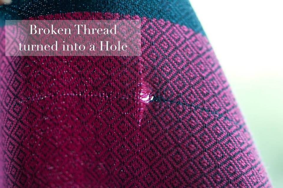 - Povytiahnuté alebo pretrhnuté nitky - taktiež veľmi bežný jav. Najčastejšie sa s tým stretávame pri jemnejších typoch šatiek tkaných žakárovou väzbou, pri šatkách s prímesou hodvábu a ručne tkaných šatkách. Nitky sa môžu vytiahnuť už počas procesu tkania alebo neskôr pri používaní šatky. Táto vada nemá vplyv na pohodlné nosenie ani na bezpečnosť. Vytiahnuté nitky sa dajú jednoducho opraviť.