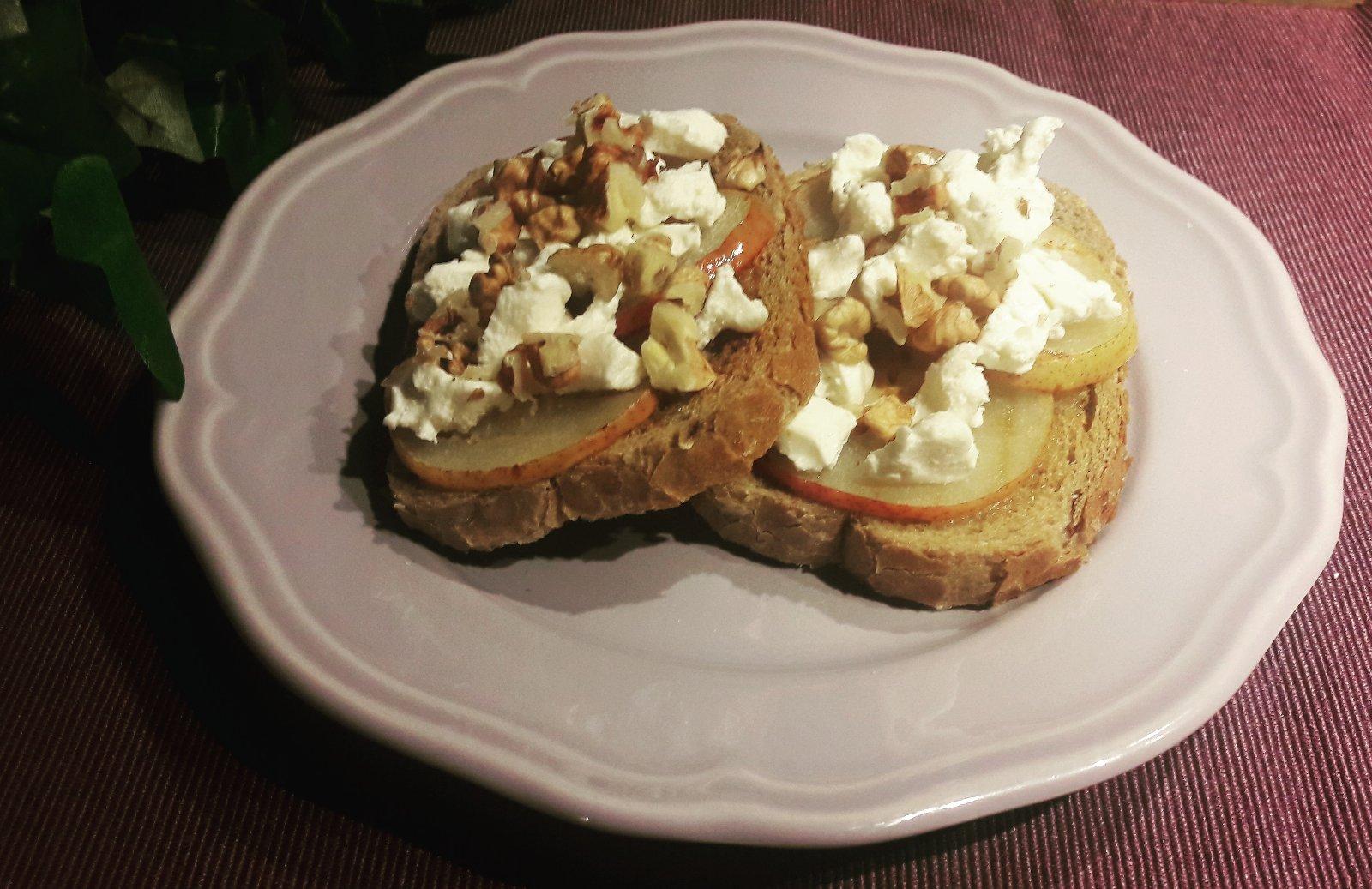 Opeceny celozrnny chlebik, grilovana hruska, kozi syr, vlasske oriesky