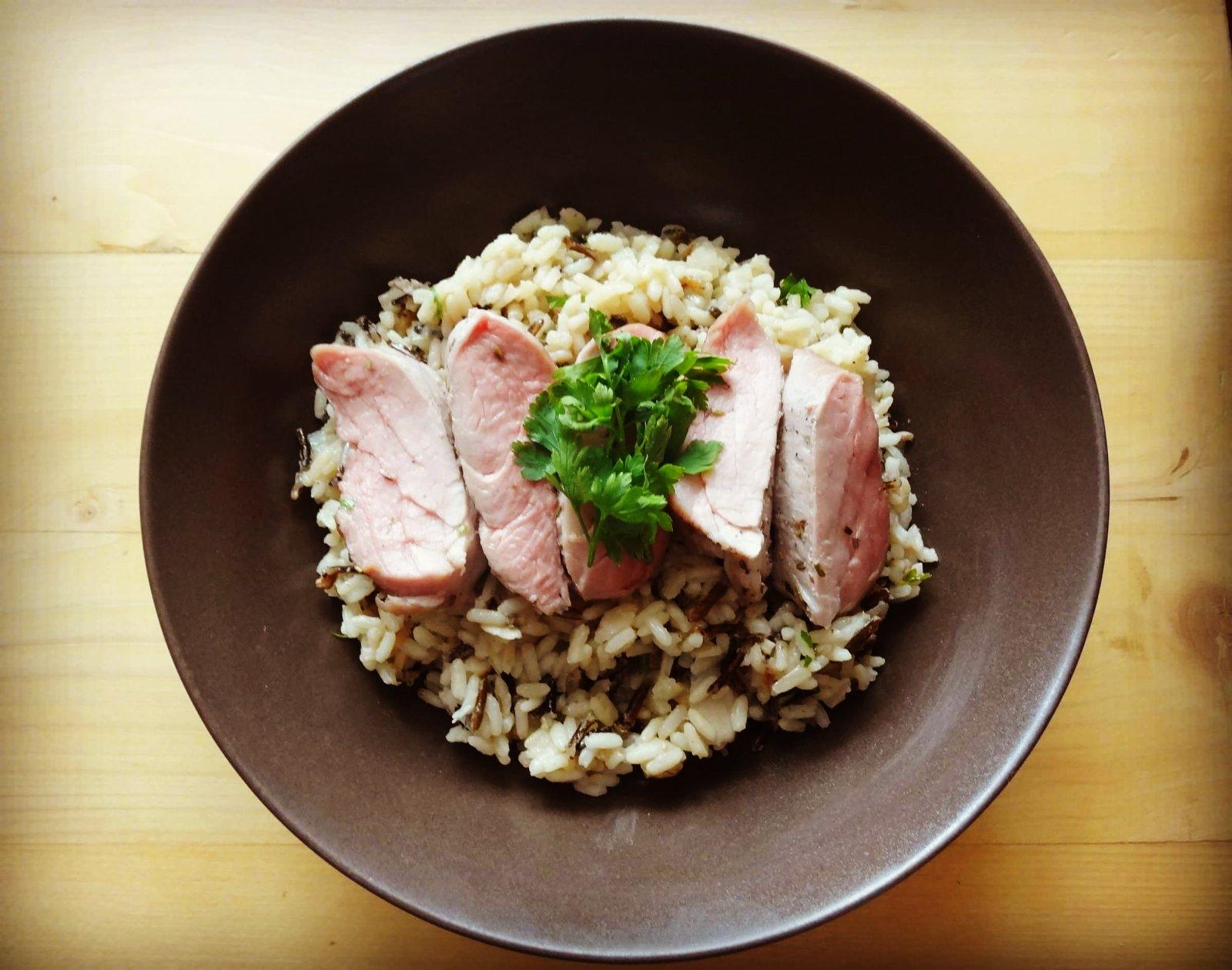 Dubákové rizoto s pomaly pečenou bravčovou panenkou