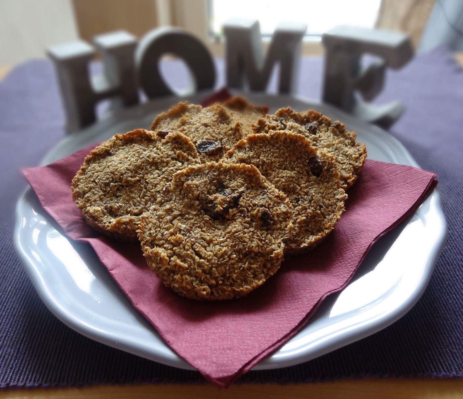 1 salku orechovej muky napr. mandlovej, ja som pouzila na jemno pomlete vlasske orechy 1 salku kokosu 1 najemno nastruhane vacsie jablko 1 vacsie vajicko 1/2 hrnceka hrozienok 1/2 ČL sody bikarbony 1-2 PL medu