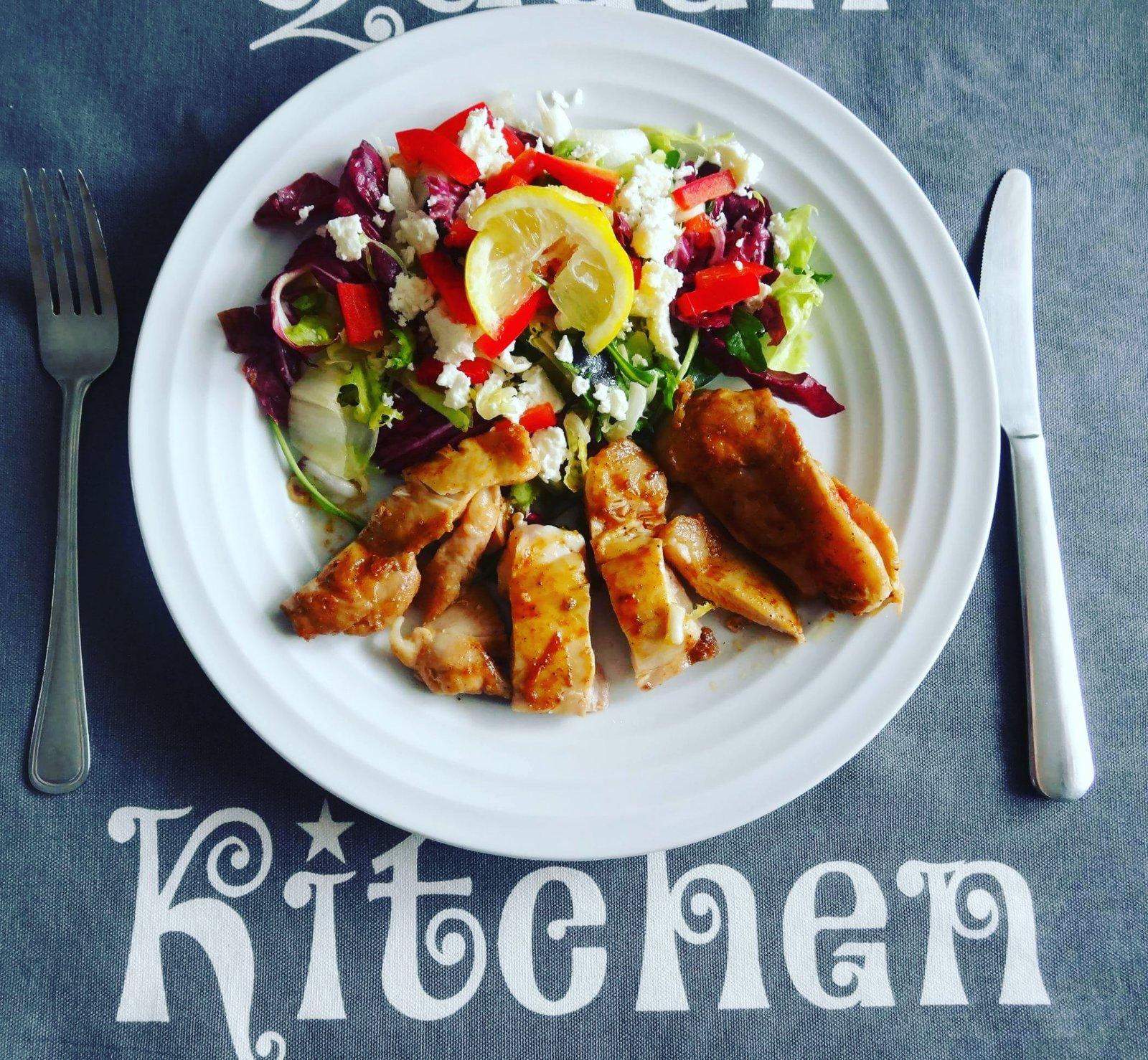 Zeleninový šalát s grilovanými kuracími prsiami, hroznom a feta syrom