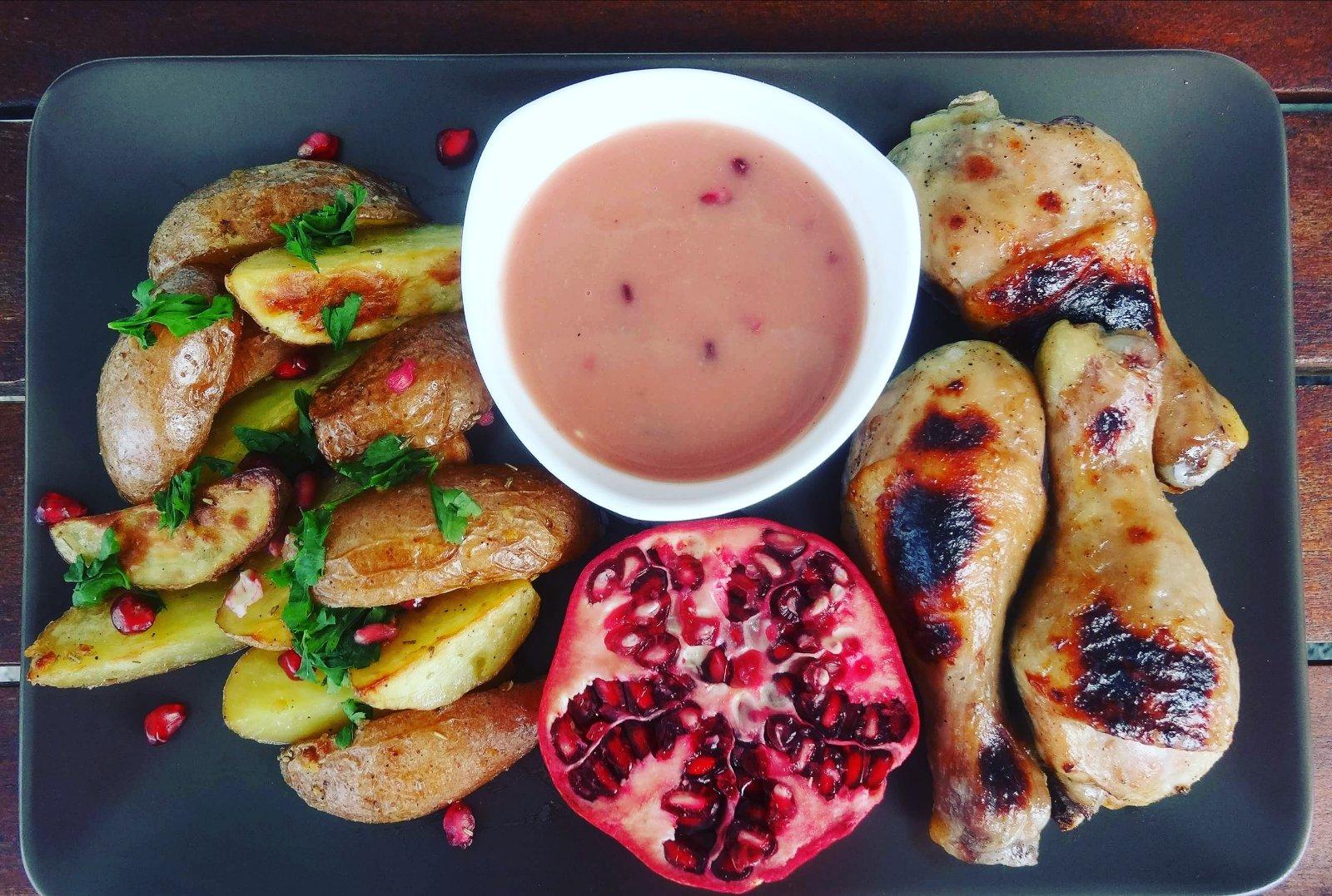 Pečené rozmarínové zemiaky s kuracím mäsom a omáčkou z granátového jablka