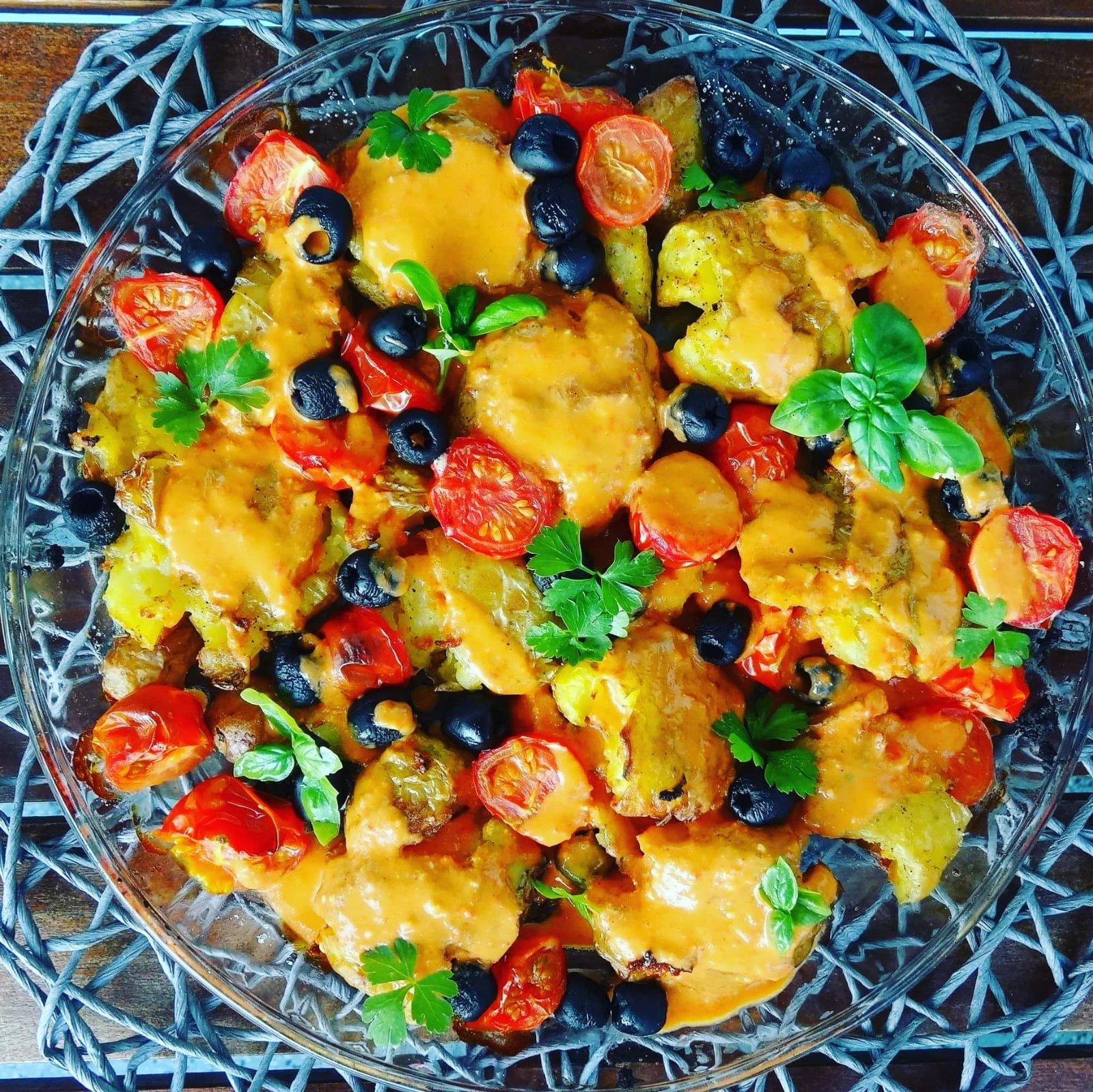 Pečené zemiaky s čiernymi olivami a cherry paradajkami