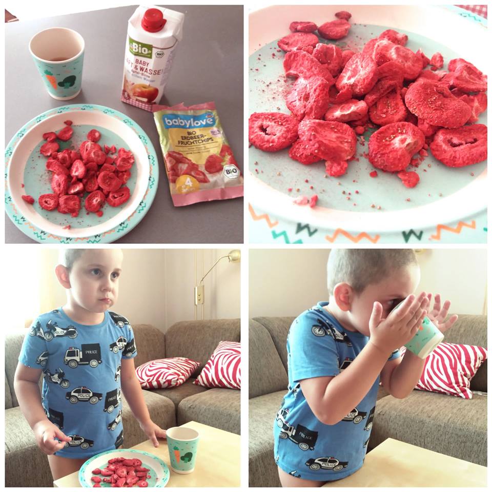 Ako prvé sme sa rozhodli otestovať Babylove Bio jahodové čipsy 12g spolu s Bio nápojom pre deti jablko-hruška 500ml. Čipsy po otvorení hneď zavoňanli a prekvapila ma ich farba. Uplne krásne červené nakrájané jahodky. Človek by čakal niečo tvrdkavé keď sa píše slovo čipsy. Opak je však pravdou. Sú úplne mäkkučke a na jazyku sa krásne rozpustia. Nasypala som na dm bambusový tanierik 🙂 Museli sme hneď aj ten otestovať. A poviem vám, len sa zaprášilo. Danielko sa do nich pustil rýchlosťou svetla. On miluje jahody. Len sme sa predbiehali aby sa nám ušlo. Mne chutili veeeeľmi. Takže už viem, čo budeme brávať ako maškrtu na cesty 🙂 Jediné mínus majú, že ich je málo v tom sáčku 😀