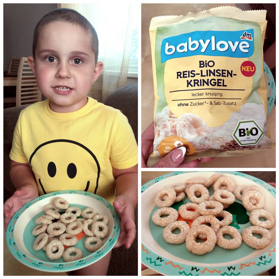 Po zjedení tyčinky bolo Dankovi málo, keďže na večeru ešte musel čakať a tak som mu nasypala Babylove Ryžovo-šošovicové chrumky 30g. Páčil sa mu ich tvar, že to neboli klasika chrumky ale koliečka, navliekal si ich na prsty a zahral sa s nimi. Po ochutnaní povedal "mňam mňam" a pohmkával si. Tanierik zpucoval do pol hoďky. Mne pripomínali klasika ryžové chlebíčky, ktoré si rada kupujem občas miesto pečiva.