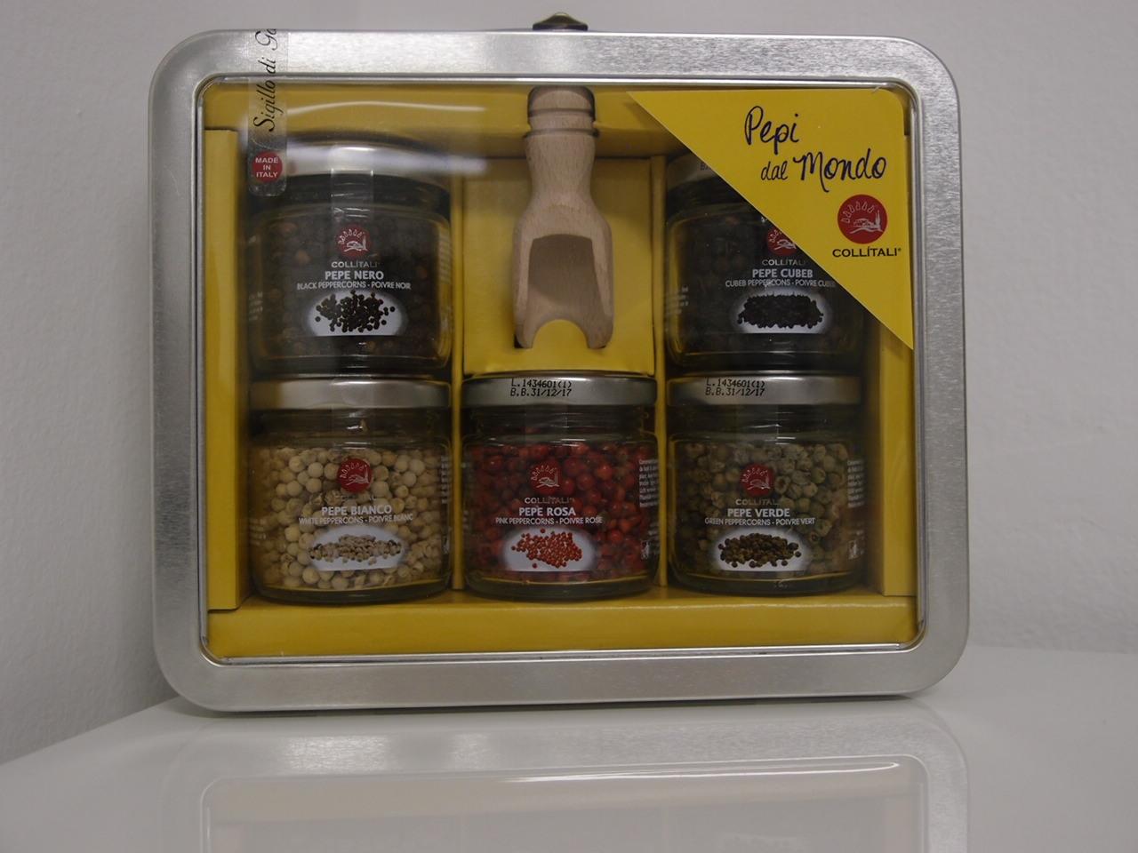 Box Korenia sveta obsahuje praktické balenie korenia rôznych farieb- čierne, biele, ružové, zelené a korenia cubeb. V balení s praktickou naberačkou