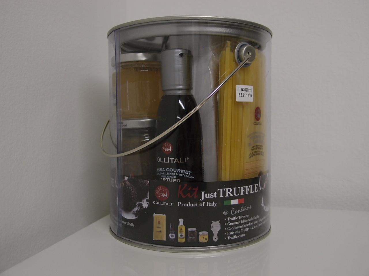 Hľuzovkový kit obsahuje glazúru s hľuzovkami, olivový olej s hľuzovkami, med s hľuzovkami, paté s hľuzovkami, hľuzovkové cestoviny a nôž na servírovanie. Lahôdka pre pravých gurmánov