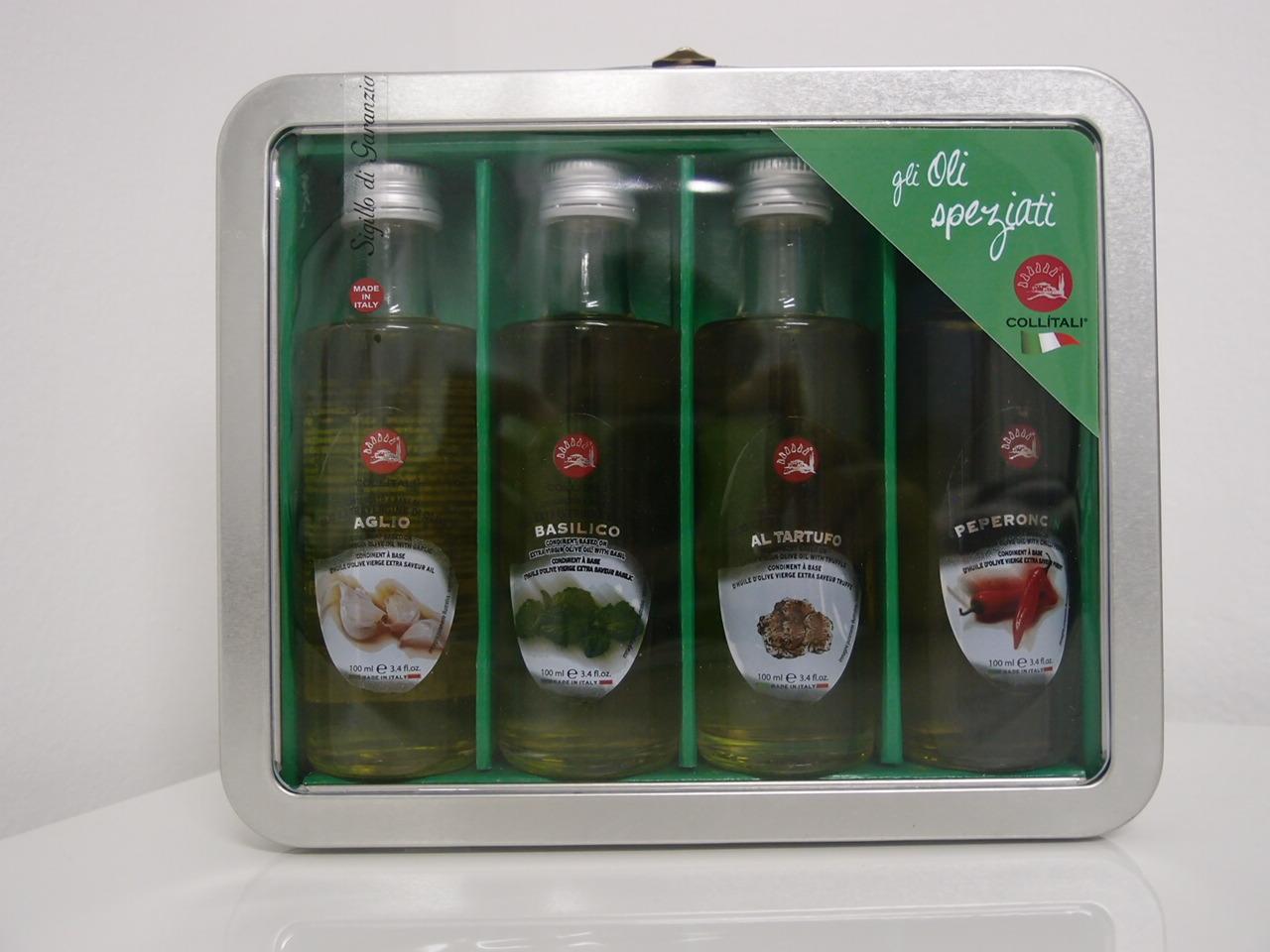 Box štyroch aromatizovaných olejov- cesnak, bazalka, hľuzovky a chilli. 4x 100ml