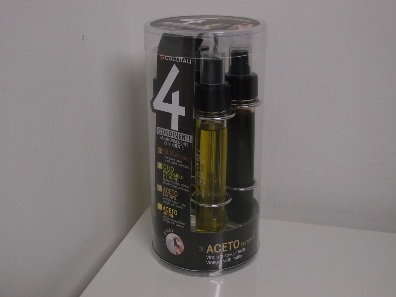 4 condimenti Set Oliera- obsahuje olivový olej s citrónom a petržlenom, olivový olej s arómou húb, balzamikový ocot s citrónom a balzamikový ocot s hľuzovkami