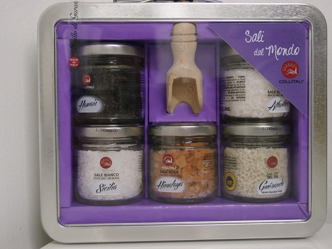 Pekný box solí z celého sveta- havajská červená, atlantická, sicílska, himalájska a Guérande. V balení s praktickou naberačkou