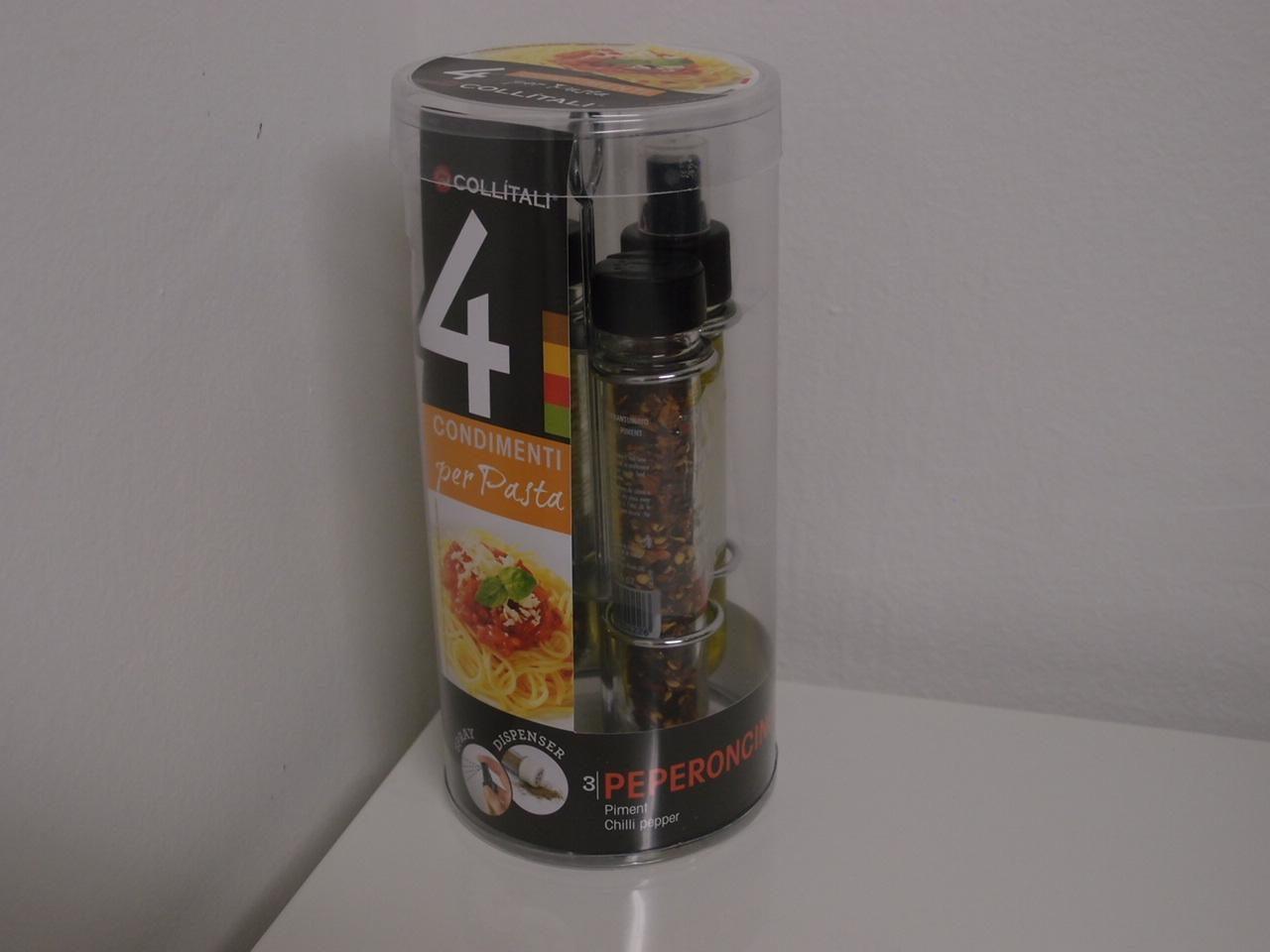 Set 4 condimenti per pasta obsahuje extra panenský olivový olej s rozprašovačom- bruschetta, bazalka, ďalej chilli a mix korenín na cestoviny. Pre milovníkov talianskej pasty určite ideálny darček 🙂