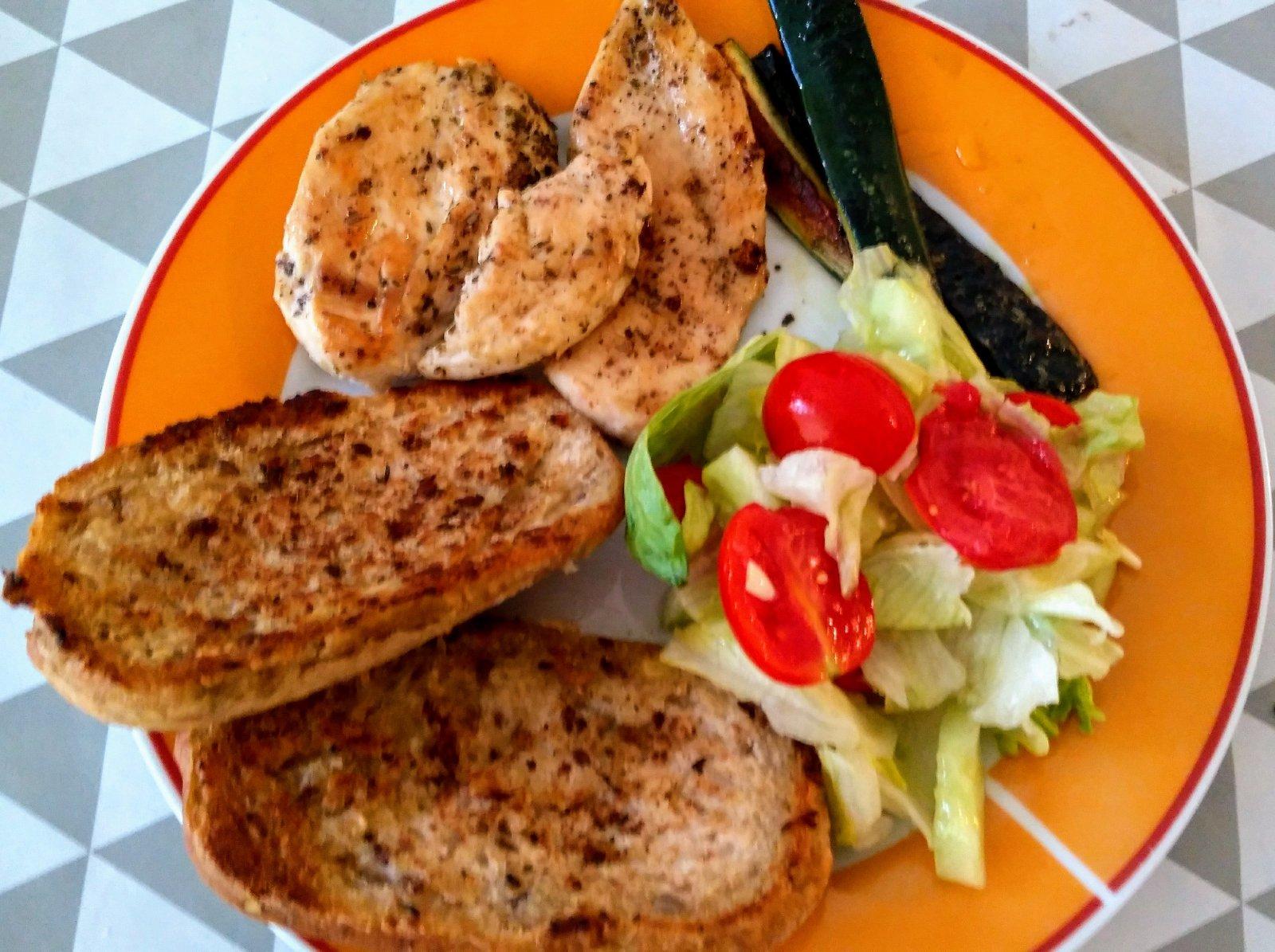 Kuracie prsia opečené, žemlička zelenina cuketa
