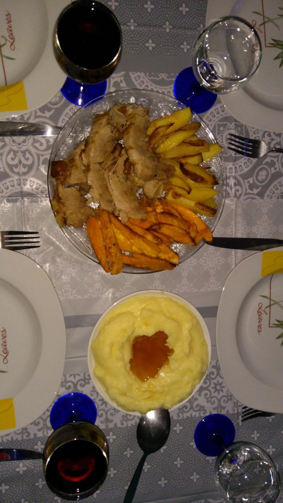 Pečené prešpikované pliecko, pečené zemiaky,bataty a zemiaková kaša