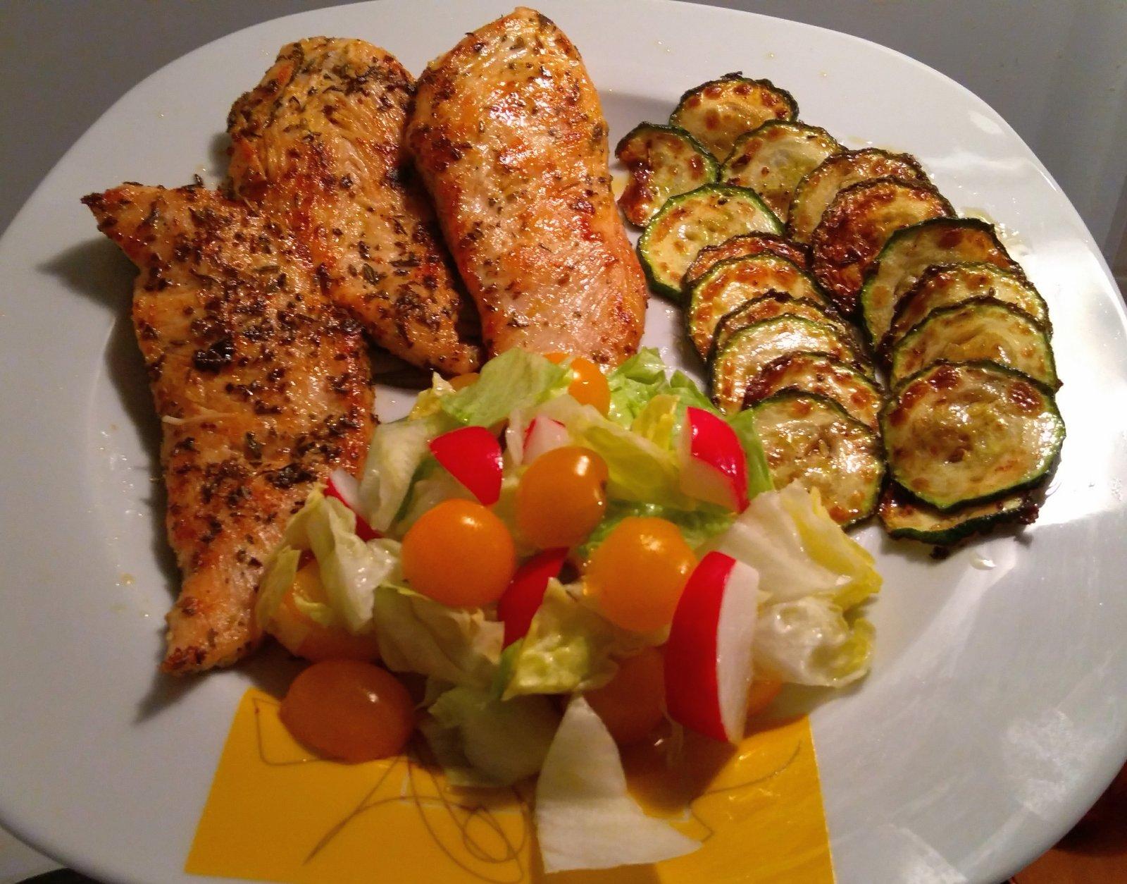 Kuracie prsia,paprikove korenie, provensálske bylinky, opečená cuketa, zeleninový šalát