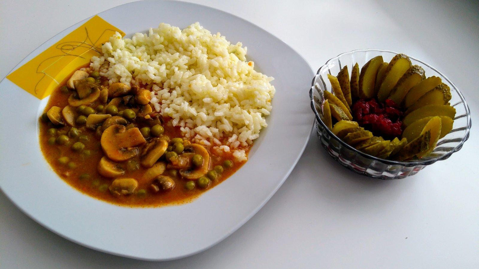 ryža a opečena cibuľka, šampiňóny tiež trošku opiect posypať vegetou a paprikou. Zaliať vodou a pridat sterilizovany hrášok. Chvíľku nechať prevrieť. Ja som zahustila Hraškou
