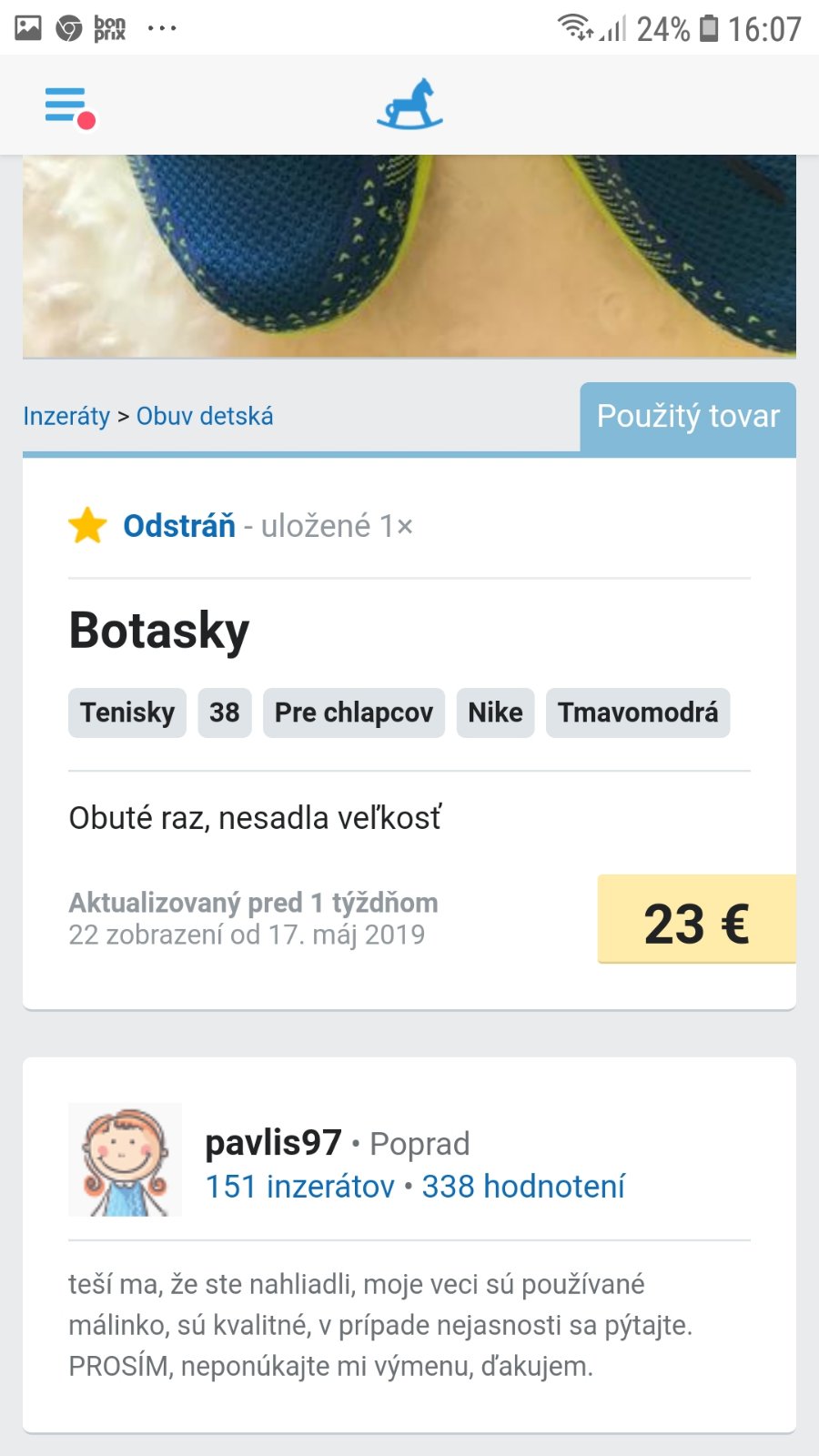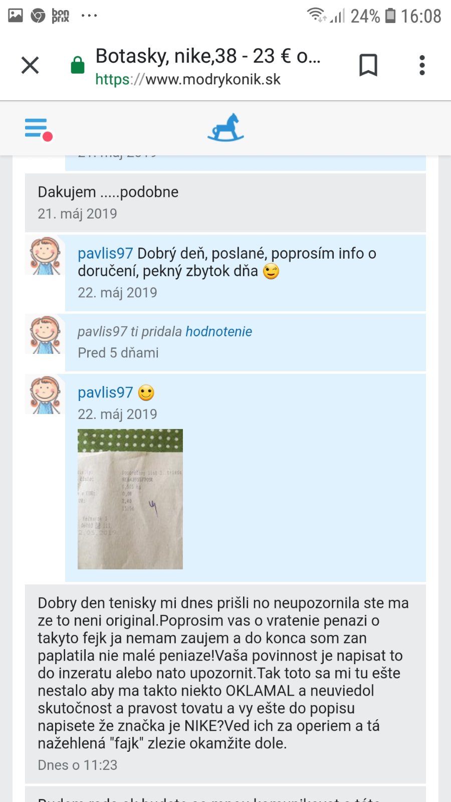 Dnes sa mi stala dost nemila vec.Pred tyzdňom som si tu na MK v barazi objednala u jednej "predavajucej" tenisky pre syna.Fotky vyzerali celkom fajn v popise bolo že málo nosene a značka NIKE vravim si fajn vezmem ich synovi.Tak mi dnes aj dorazili no ako som otvorila balik onemela som od "úžasu" ,miesto original NIKE tenisiek tam boli akesi NAJKY 😱 z nalepenou fajkou,proste fejky ako lusk👌👍.Ked som pani pisala že prečo ma oklamala a nenapisala pravdivy popis do inzeratu tak sa este ona pustila do mna že som sa nato mala opytat či sú prave alebo nie.Ako už som tu čitala hoci čo aj som videla na bazari že mamičky predavajú aj fejky ale VŽDY tam bolo nato upozornené.No zaujimavé že tato dotyčna mi nato odpisala že ona neni povinna pisat žiadnu pravdu do popisu.Ako to čo je za chrapunstvo:( je mi zle s takychto ludí čo sa vedome idú obohacovat na vlastych klamstvách.Žiadala som ju o vratenie 23€ a že jej tie ORIGINALI hned vratim lebo ja o tieto ohavy zaujem nemam ale ona odmieta na seba vziat zodpovednost a priznat si že ma VEDOME OKLAMALA a nenapisala skutočnost o danom tovare.Prosim vás na koho sa môžem obratit aby sa s tym niečo dalo urobit.Dakujem za každu radu.