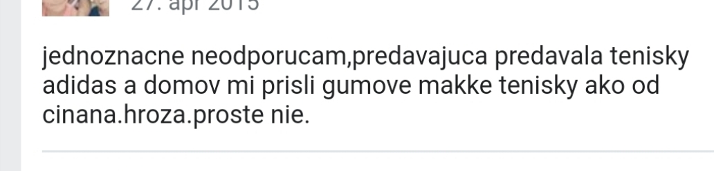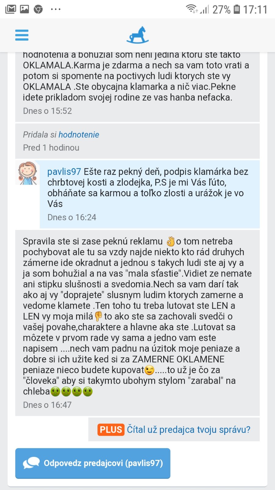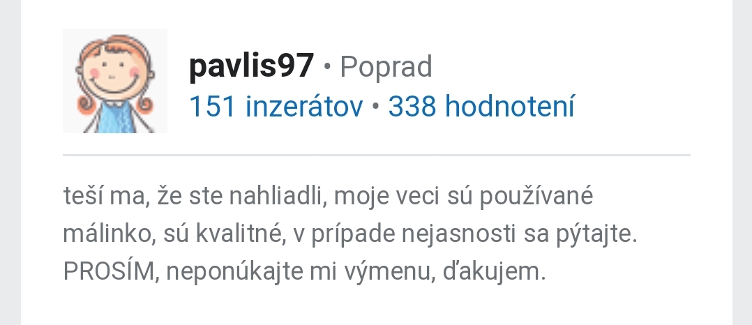 @pavlis97 hanbit sa mozete vy a isto nie som prva co sa nejakej predavajucej pytala na dohodu o cene tak nechapem s čim sa tu idete vy ohanat.Pointa je v tom ze ste mi predala smejdy ktore ste mala uvedene ako značku NIKE a pytala zane nehoraznu sumu kktoru som vam uhradila .... a snahu vam ulahčim a spravy sem pridam ja sama lebo moje svedomie je čiste .Ja smeliny nepredavam a potom sa tu nejdem hrat na obeť.