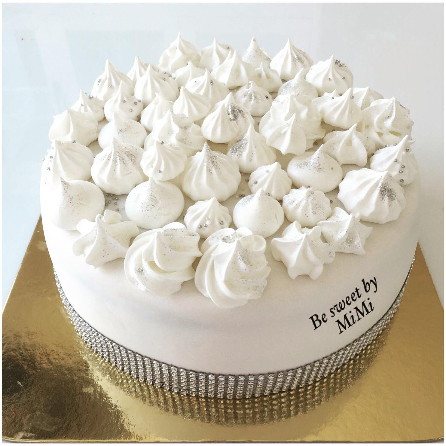 Tortička na1.sv.prijimanie. Vanilkový korpus, čokoládový mousse s bananom, ozdobené meringues 🙂