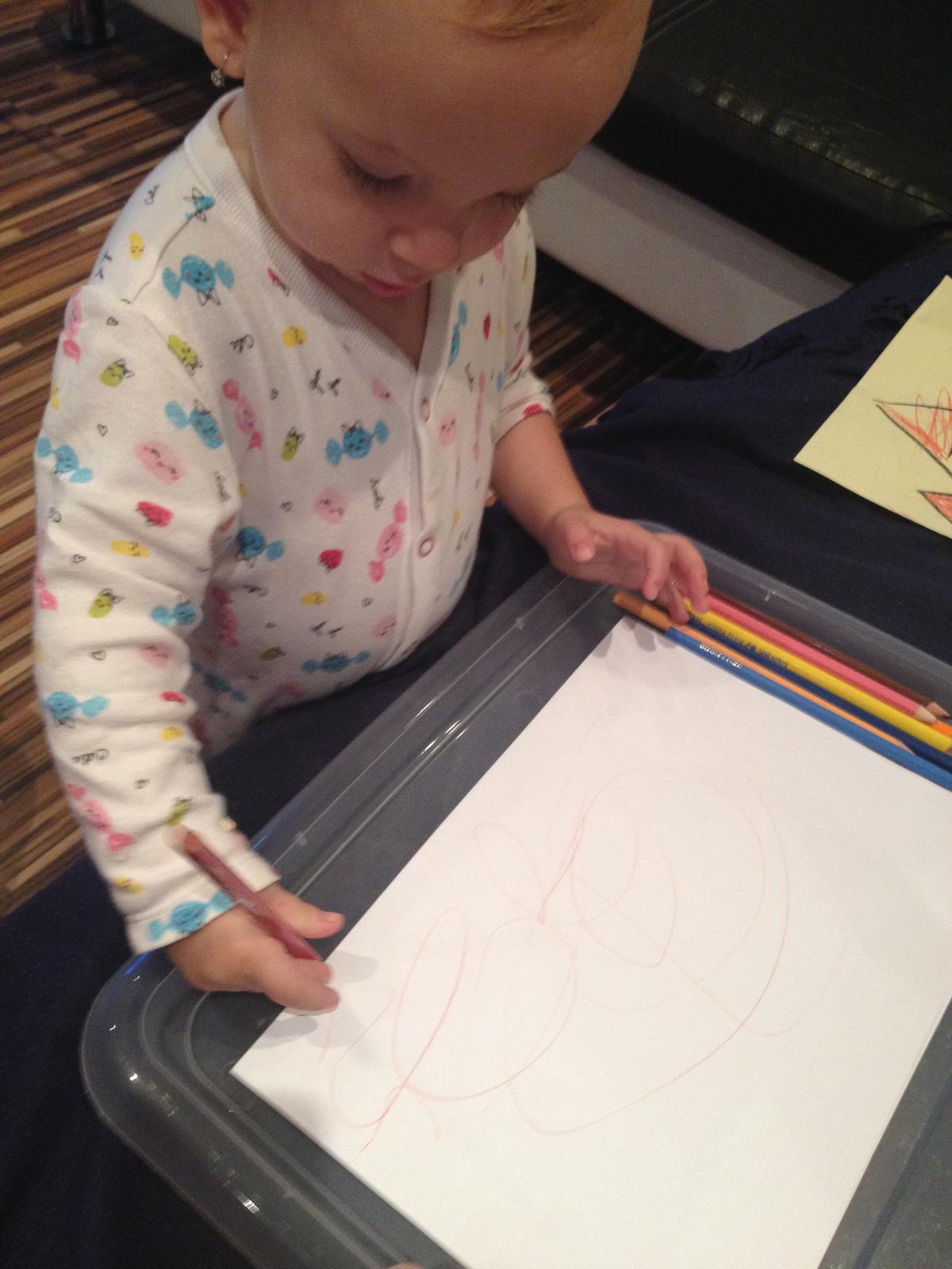 Moze 16.mesacne babo takto kreslit? Ja este spím a ona si vytiahla papier s farbičkami ze :,,kolo kolo kolo bac,....." A kreslí a ja sa nestiham čudovať!!!!